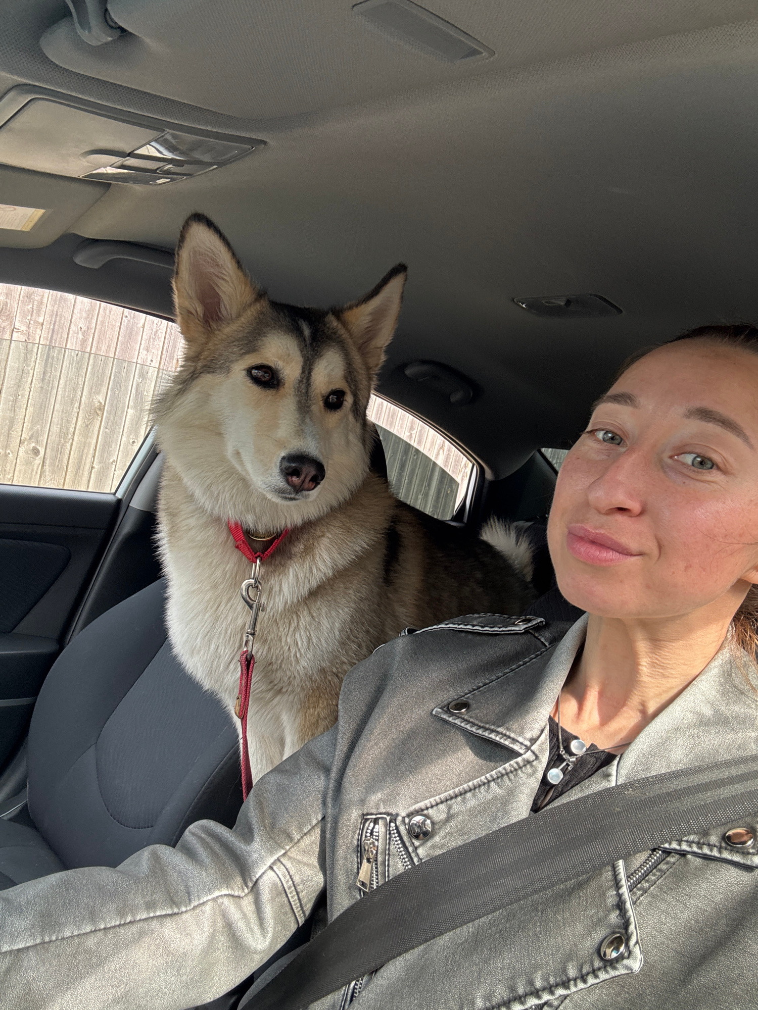 A woman is taking a selfie inside a car with a dog. The woman has fair skin, light eyes, and her hair is pulled back. She is wearing a grey jacket. The dog, a husky mix, is sitting on the passenger se…read more