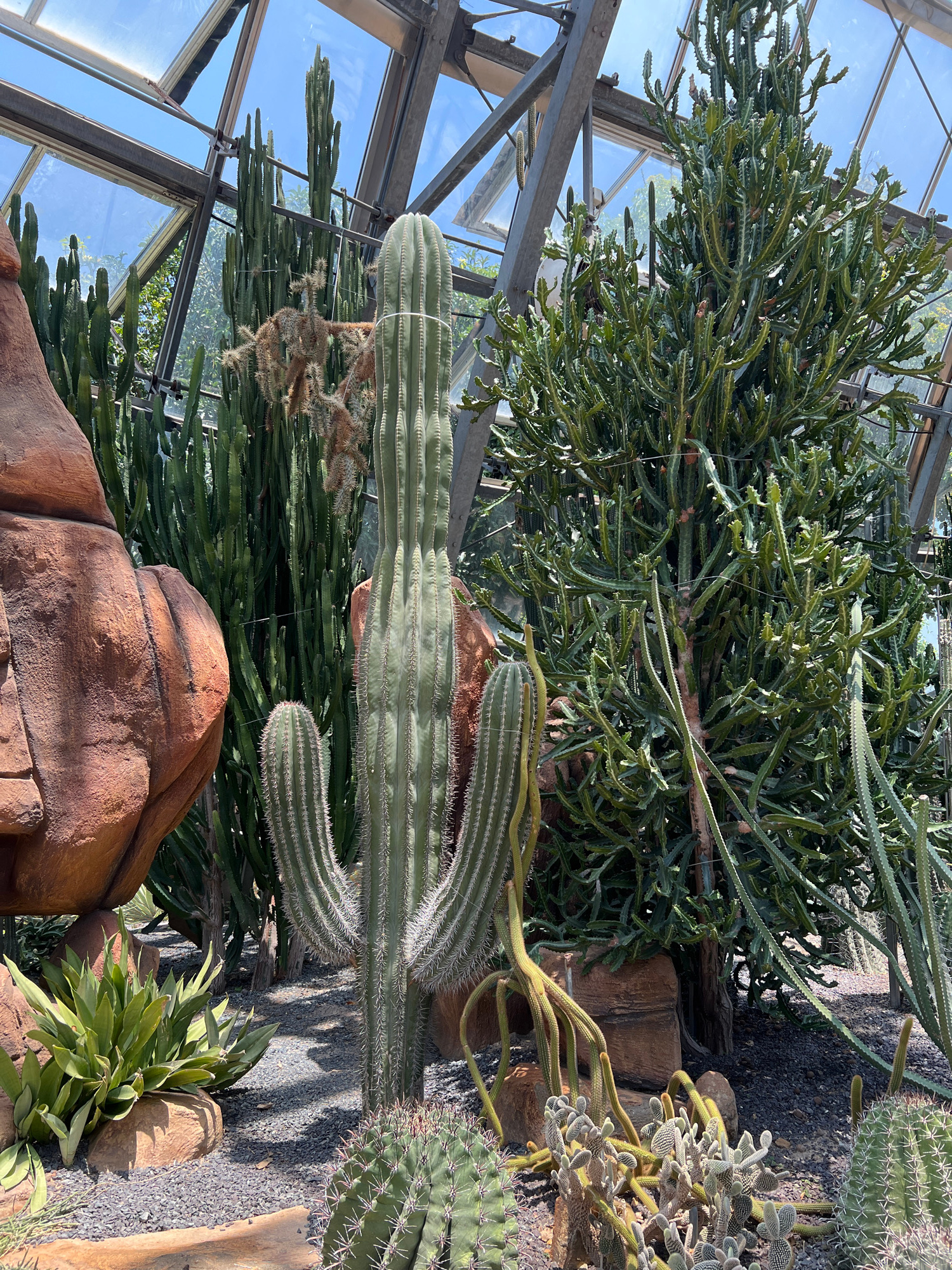 The image captures the interior of a greenhouse or botanical garden, likely located in a tropical region. The structural supports of the greenhouse are visible, creating a framed view of the sky and t…read more