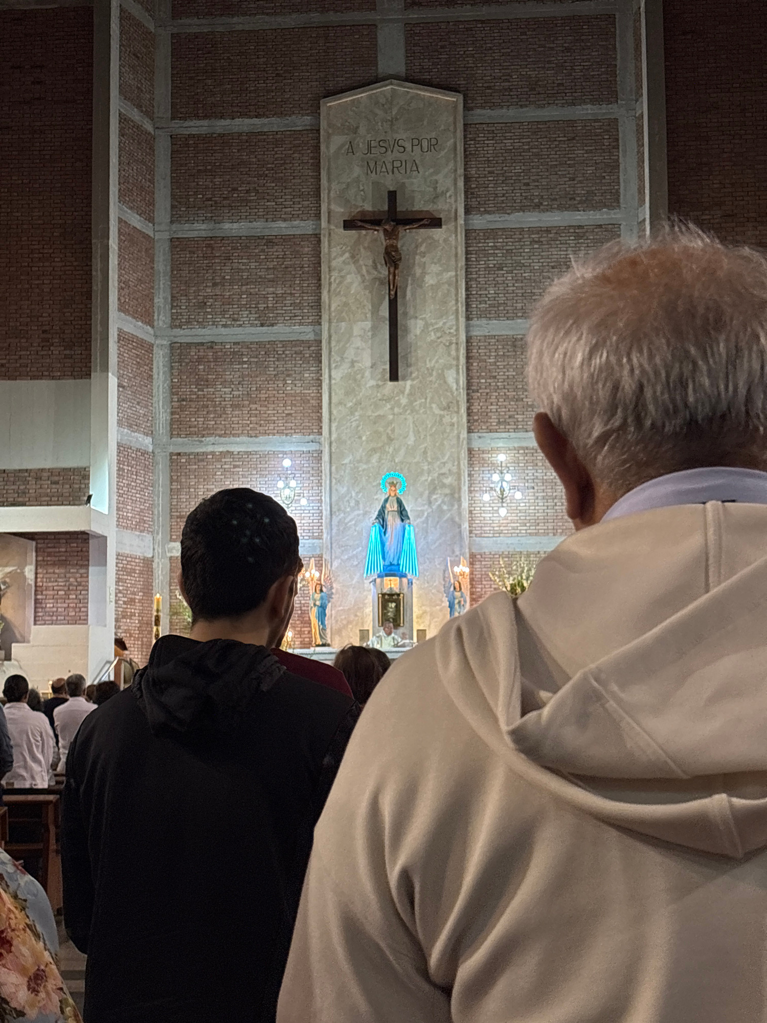 A church interior in San Isidro, Peru, shows a crowd of people attending a religious service. An elderly man with gray hair, wearing a white hooded sweatshirt, stands in the foreground. Behind him, a younger person with dark hair is partially visible, wearing a dark jacket. The people in the church are attending a religious service, as indicated by the presence of religious symbols, including a crucifix and a statue of the Virgin Mary, both centrally placed on the wall behind the altar. The walls of the church have a brick design and are lit with subtle light fixtures. The interior is illuminated, casting light on the participants. The overall atmosphere of the scene is solemn and respectful. Other parishioners are seated in rows. | Open Wire