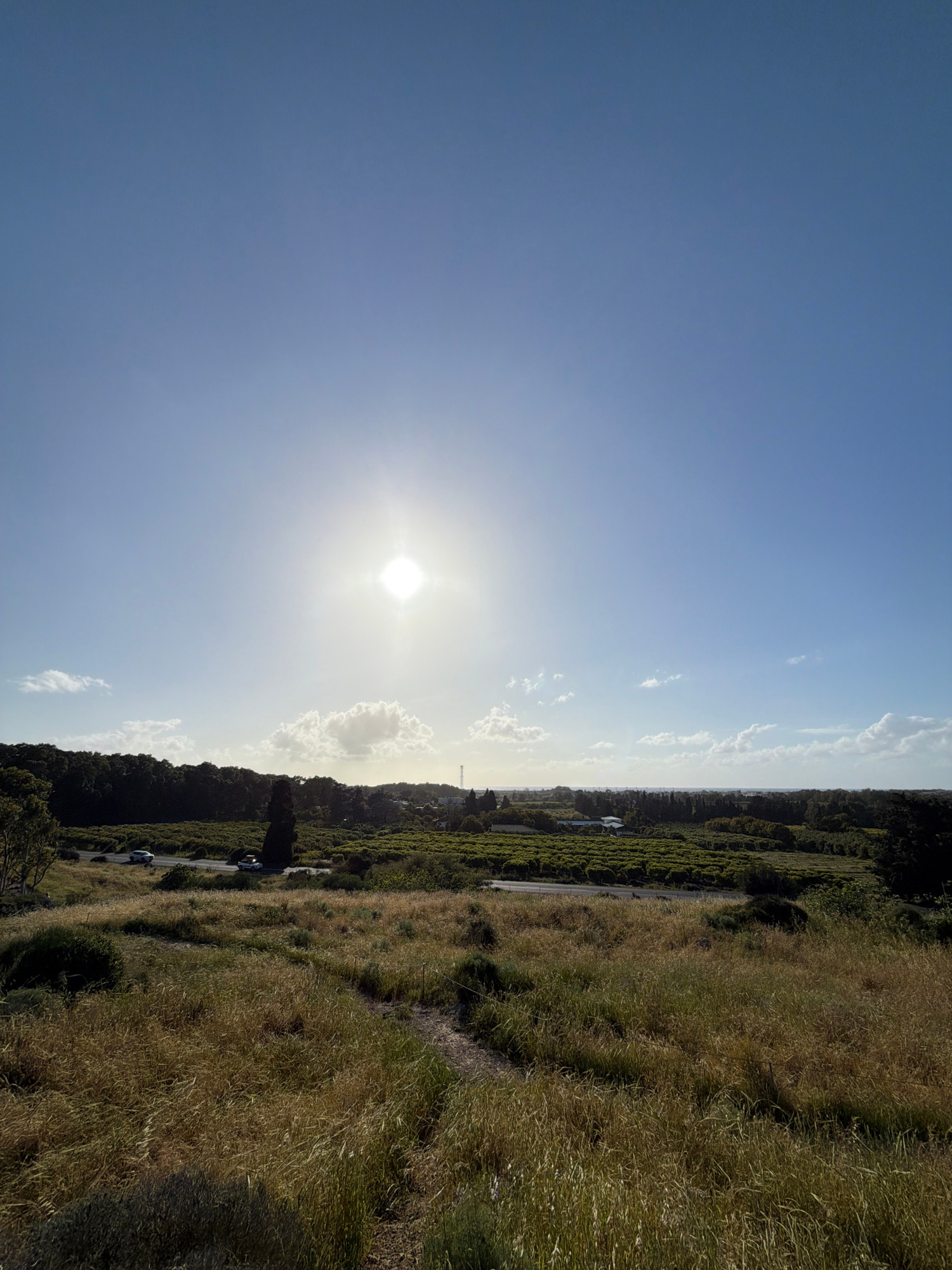 The image depicts a bright, sunlit scene near Kfar Vitkin, Israel. The sky is predominantly clear blue, with the sun prominently positioned in the frame. A narrow strip of land is visible along the riβ¦read more