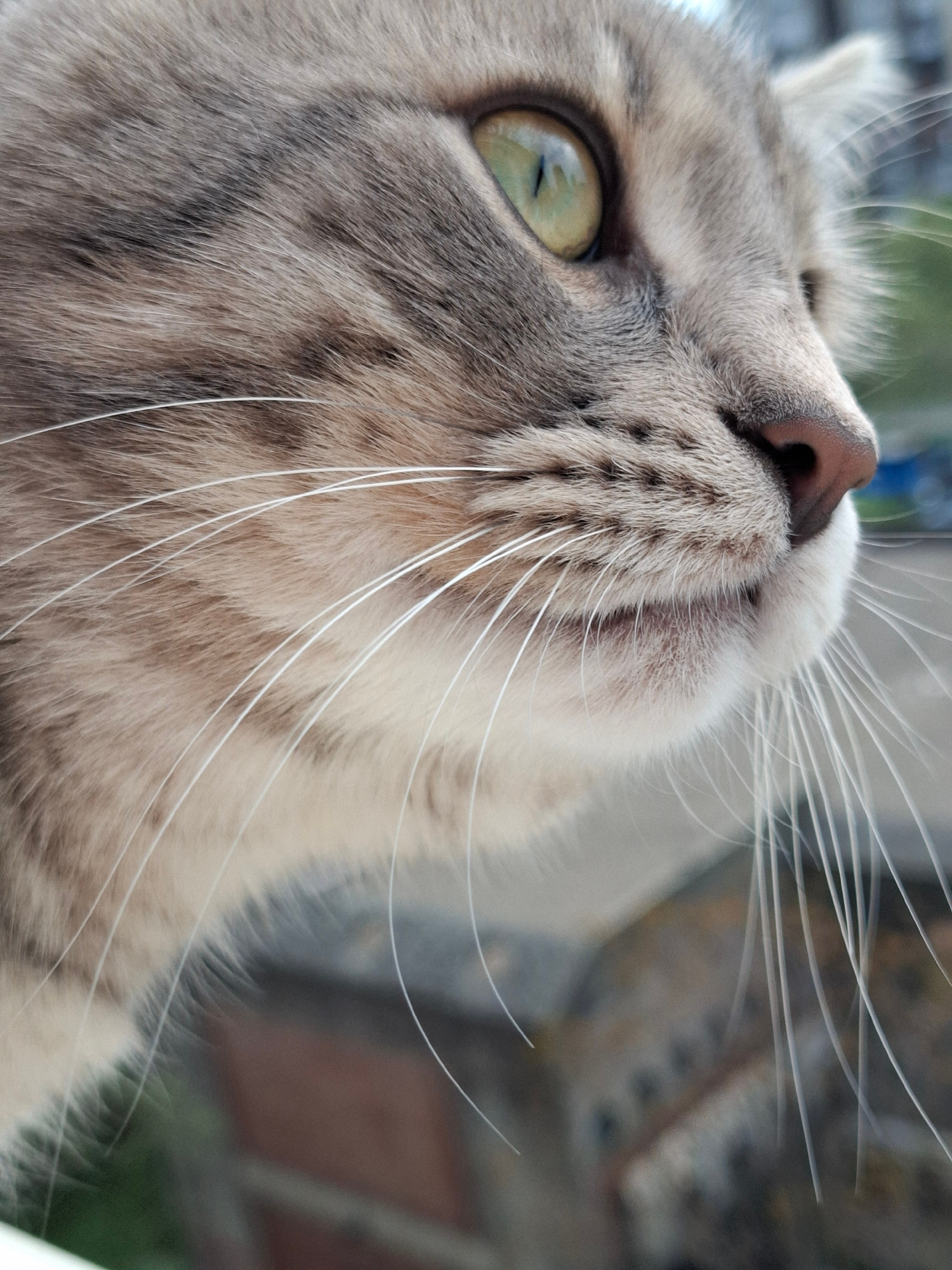 A close-up, eye-level, side-profile shot captures a domestic cat, likely a tabby, gazing intently upwards. The cat's head fills most of the frame, angled towards the upper right. Its fur is a blend of…read more