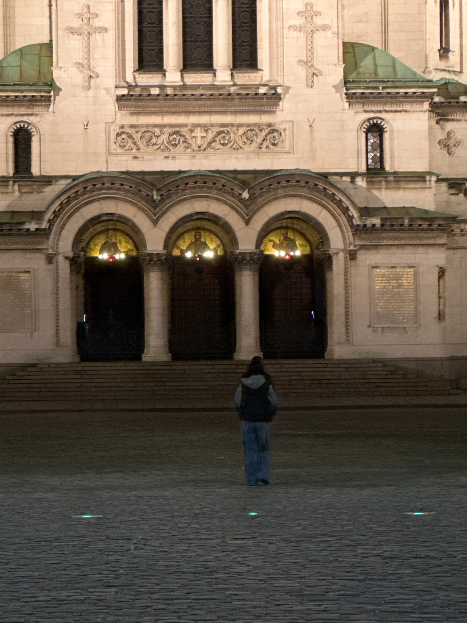The image shows the Alexander Nevsky Cathedral in Sofia, Bulgaria, at night. The cathedral's facade is illuminated, revealing intricate architectural details, including crosses, decorative carvings, a…read more
