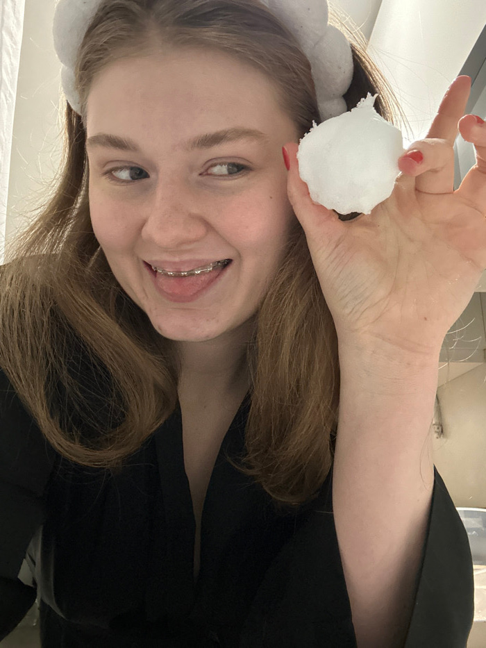 A fair-skinned young woman with light brown hair smiles at the camera, her teeth visible with braces. She holds a ball of white cotton above her head with her right hand, nails painted red. She wearsβ¦read more