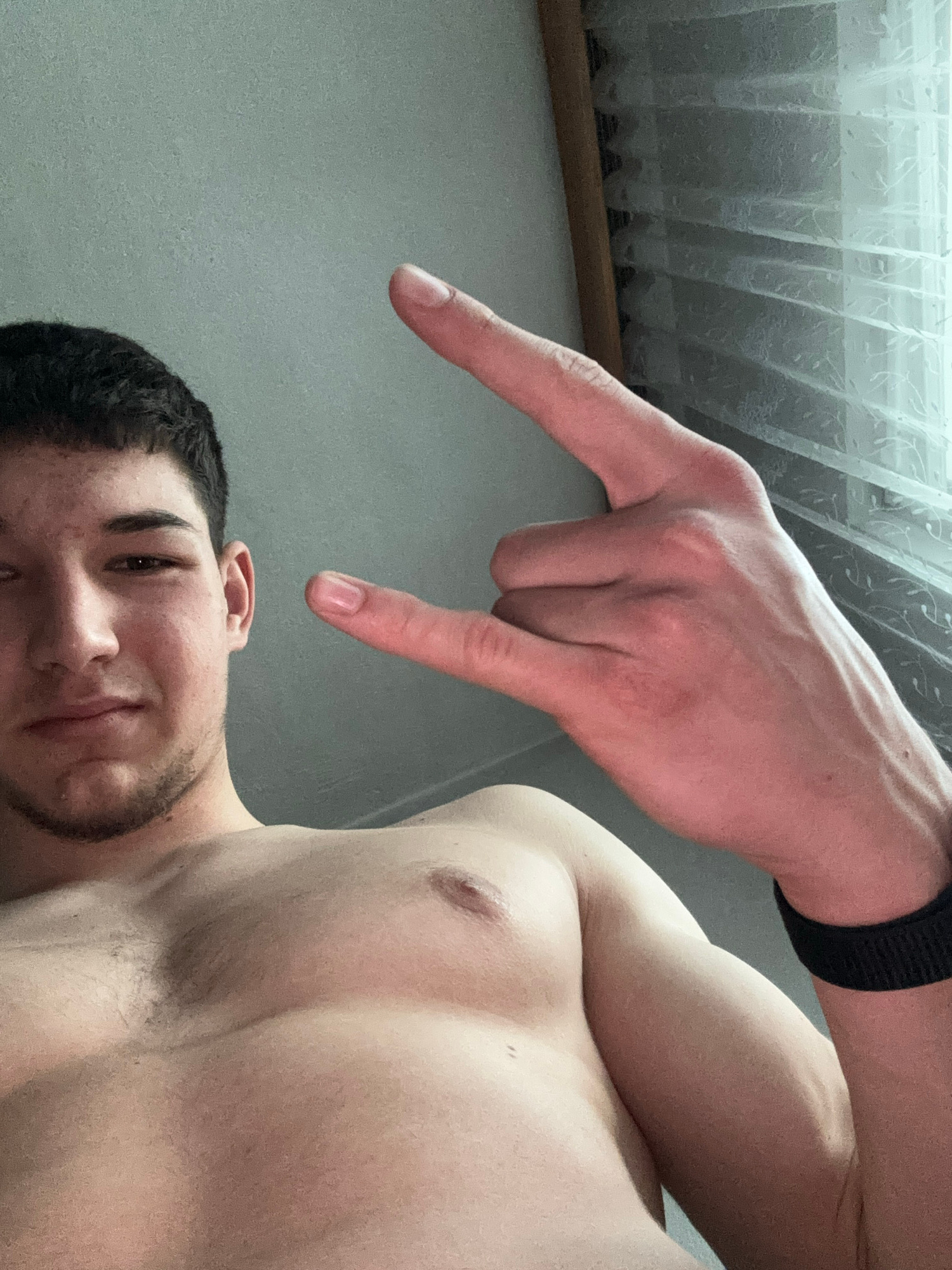 An upward-facing, rotated close-up selfie captures a man and his hand in an indoor setting in Zlatograd, Bulgaria. The primary subject is a young man, visible from his chin to just above his hairline,…read more