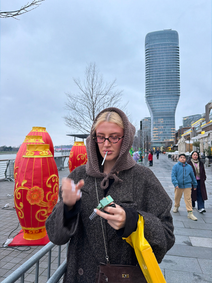 The image, oriented vertically, captures a scene featuring a person in the foreground against an urban backdrop with distinctive architecture and cultural elements. In the immediate foreground, a per…read more