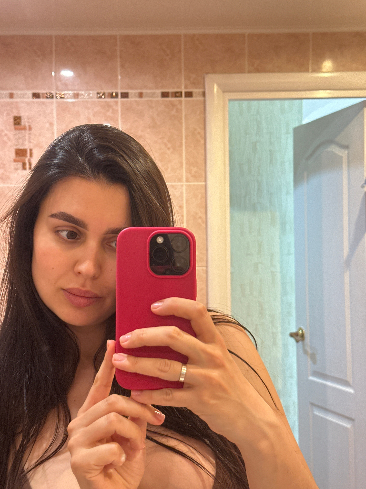 The image captures a woman taking a mirror selfie with a red smartphone. The photograph is notably tilted, positioning the woman's head towards the right side of the frame and her body extending diago…read more