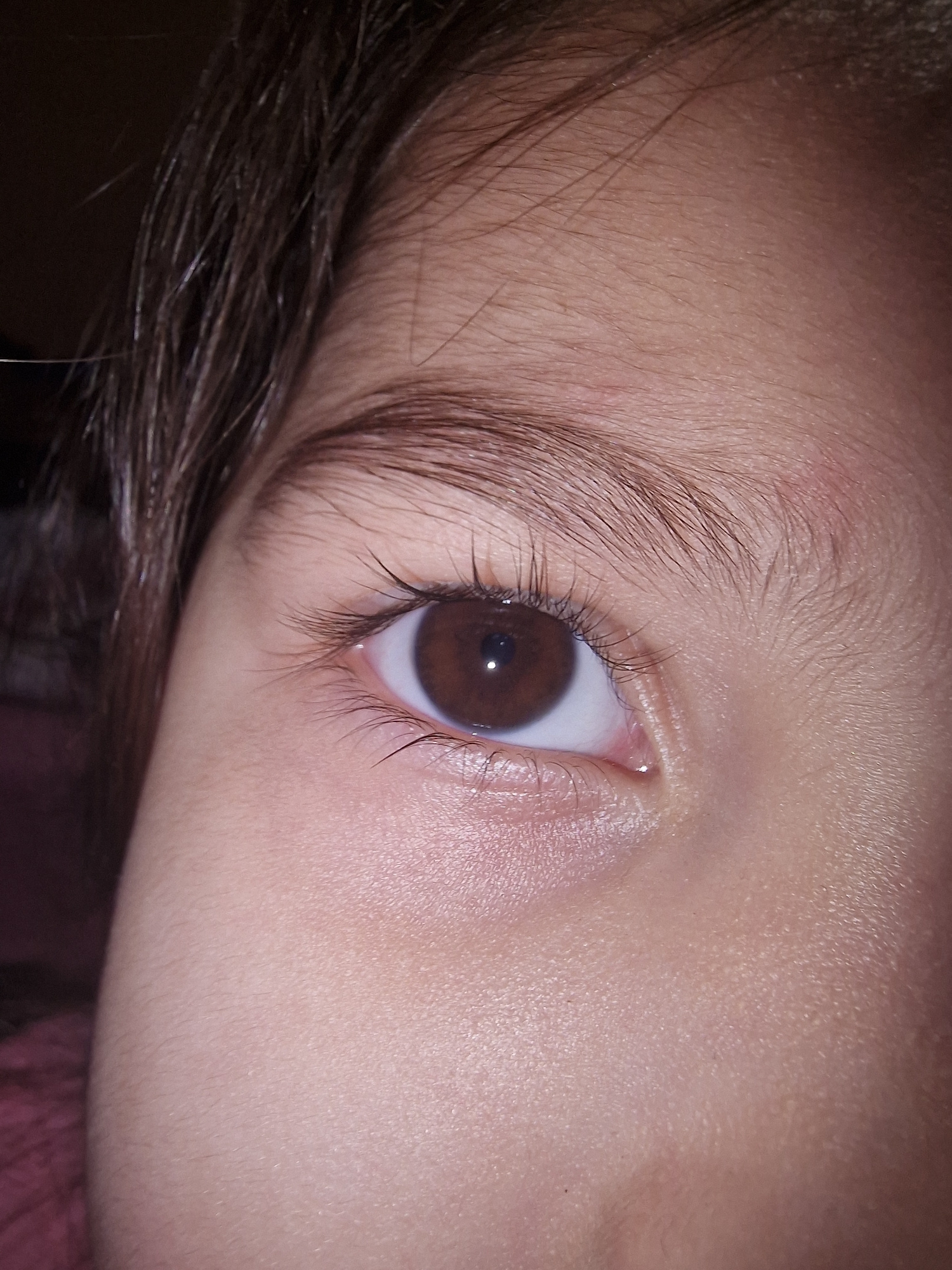 The image shows a close-up of a person's eye. The eye has a brown iris, visible eyelashes, and surrounding skin with fine hair. The image is cropped tightly around the eye and surrounding facial featu…read more