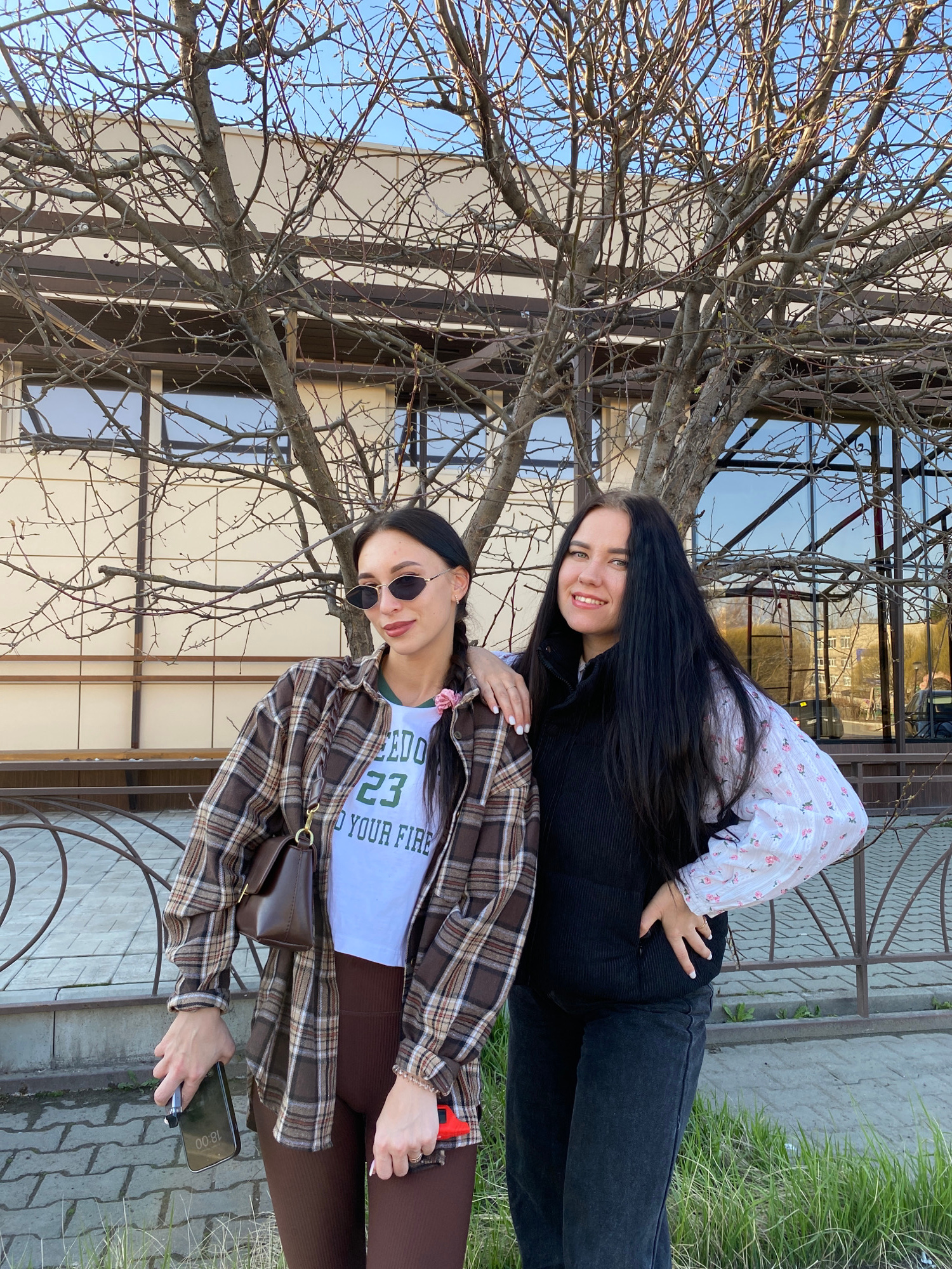 Two young women are posing for a photo outdoors. The background includes a building with large windows and a tree with bare branches. The woman on the top is smiling and has long dark hair. She wears…read more