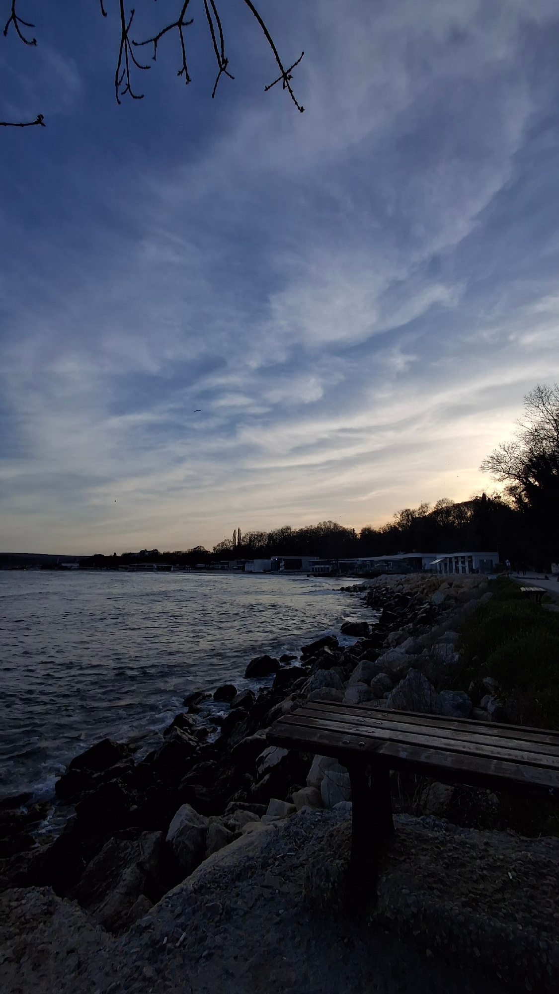 The image depicts a coastal scene in Varna, Bulgaria, at either sunrise or sunset. The sky is predominantly blue with white and grey clouds. A thin strip of light from the setting sun is visible along…read more