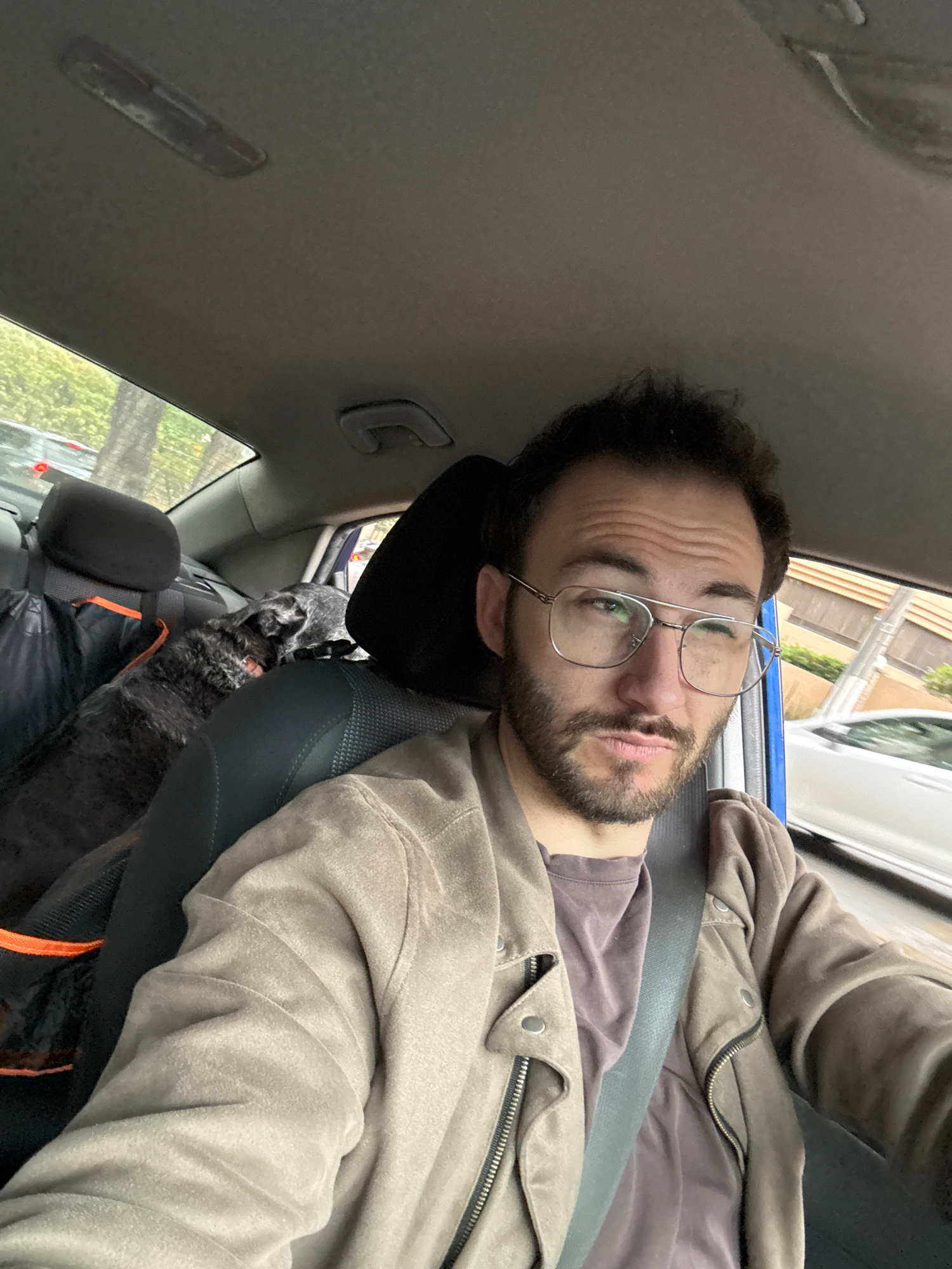 A man with glasses and a beard is sitting in the passenger seat of a car. He is wearing a brown t-shirt and a light brown jacket. A dog is visible in the back seat. The car's interior is visible, incl…read more