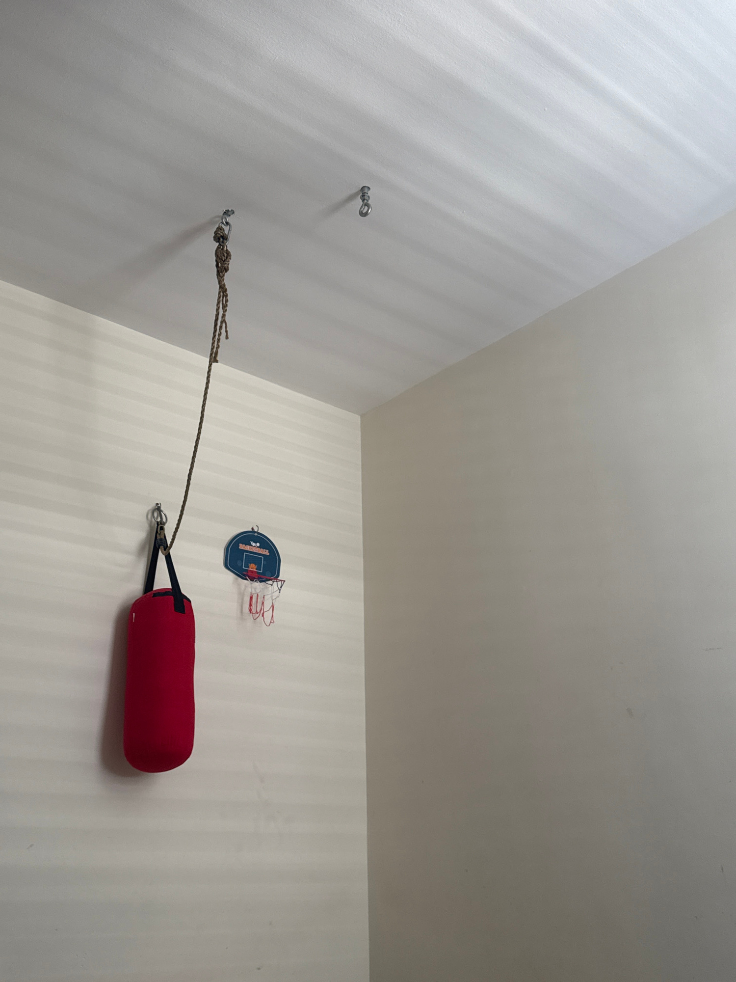 The image displays an interior corner of a room located in Tel-Aviv, Israel. The ceiling is white and contains three visible metal eye hooks; a thick, braided rope is secured to one hook in the foregr…read more