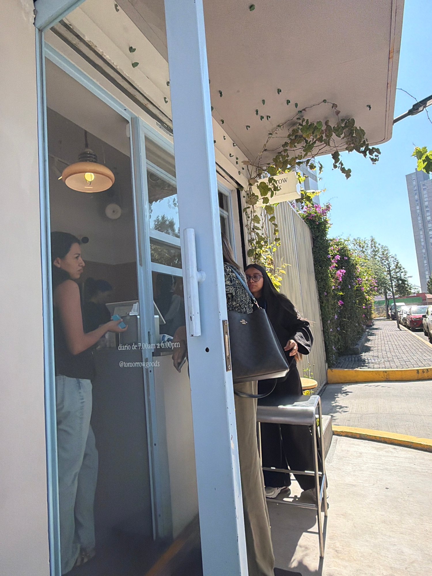 The image depicts a person sitting at a table outside a cafe, reflected in the cafe's window. The cafe appears to be named "Tomorrow Goods," judging from the text "@tomorrowgoods" visible on the windo…read more