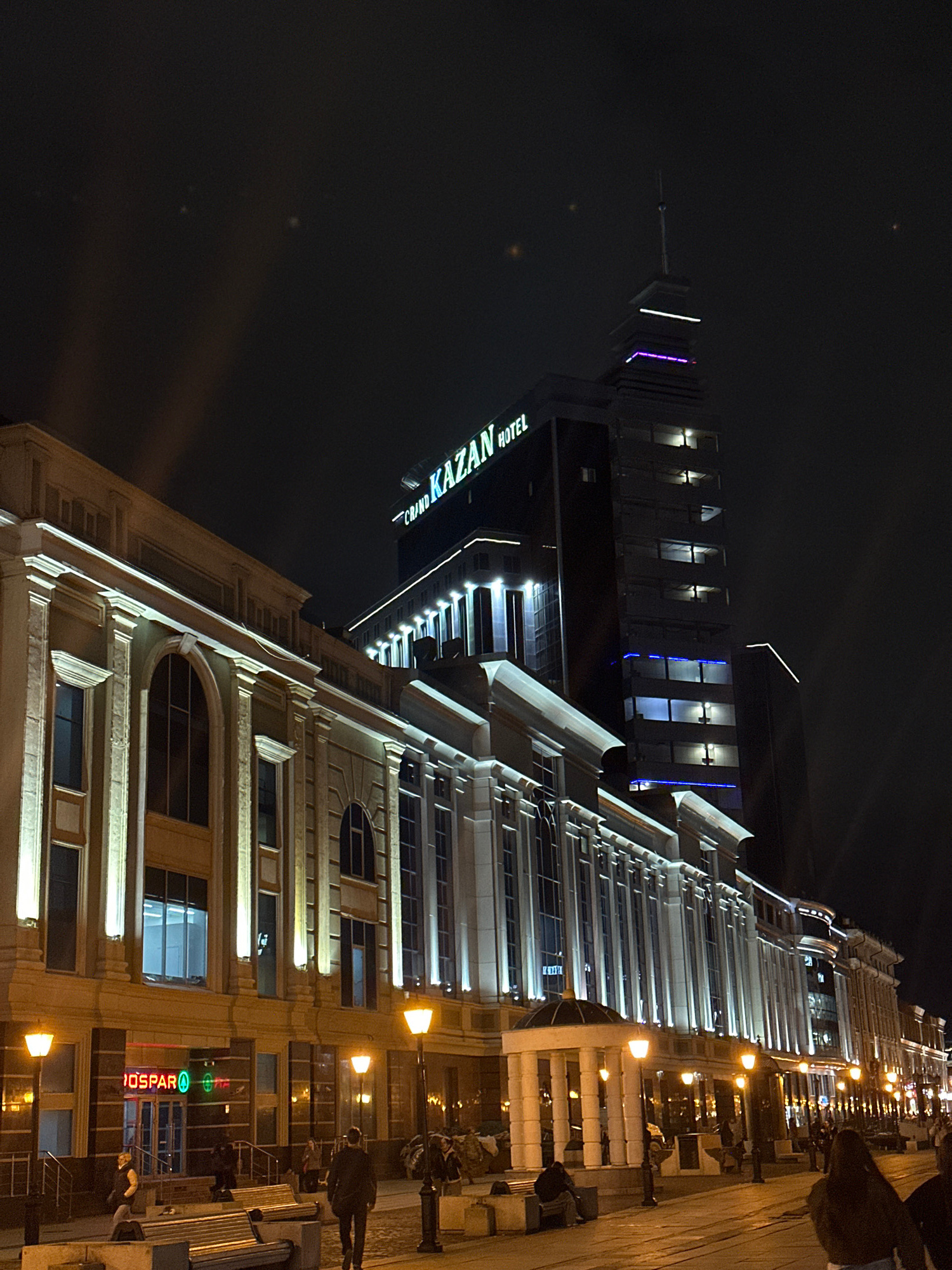 The image, taken at night in Kazan, Russia, shows two distinct buildings. On the left is the "Grand Kazan Hotel," identified by illuminated signage. The other building, adjacent and slightly right, ha…read more