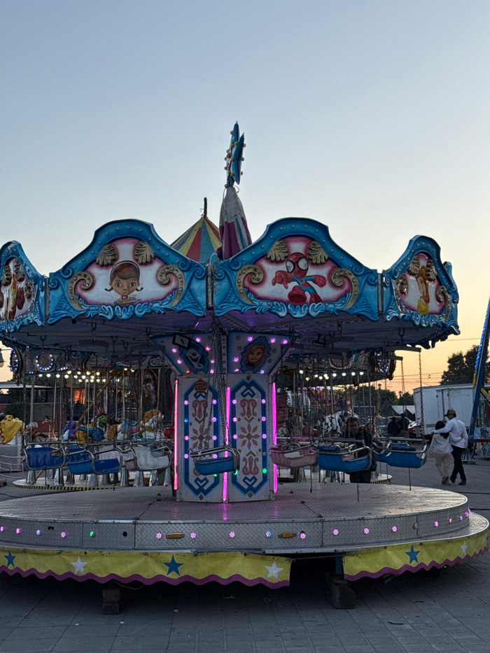 A carnival swing ride spins with empty blue seats. The ride's decorative panels showcase children's characters, illuminated by strings of lights and pink neon. Above, the evening sky fades into a mute…read more