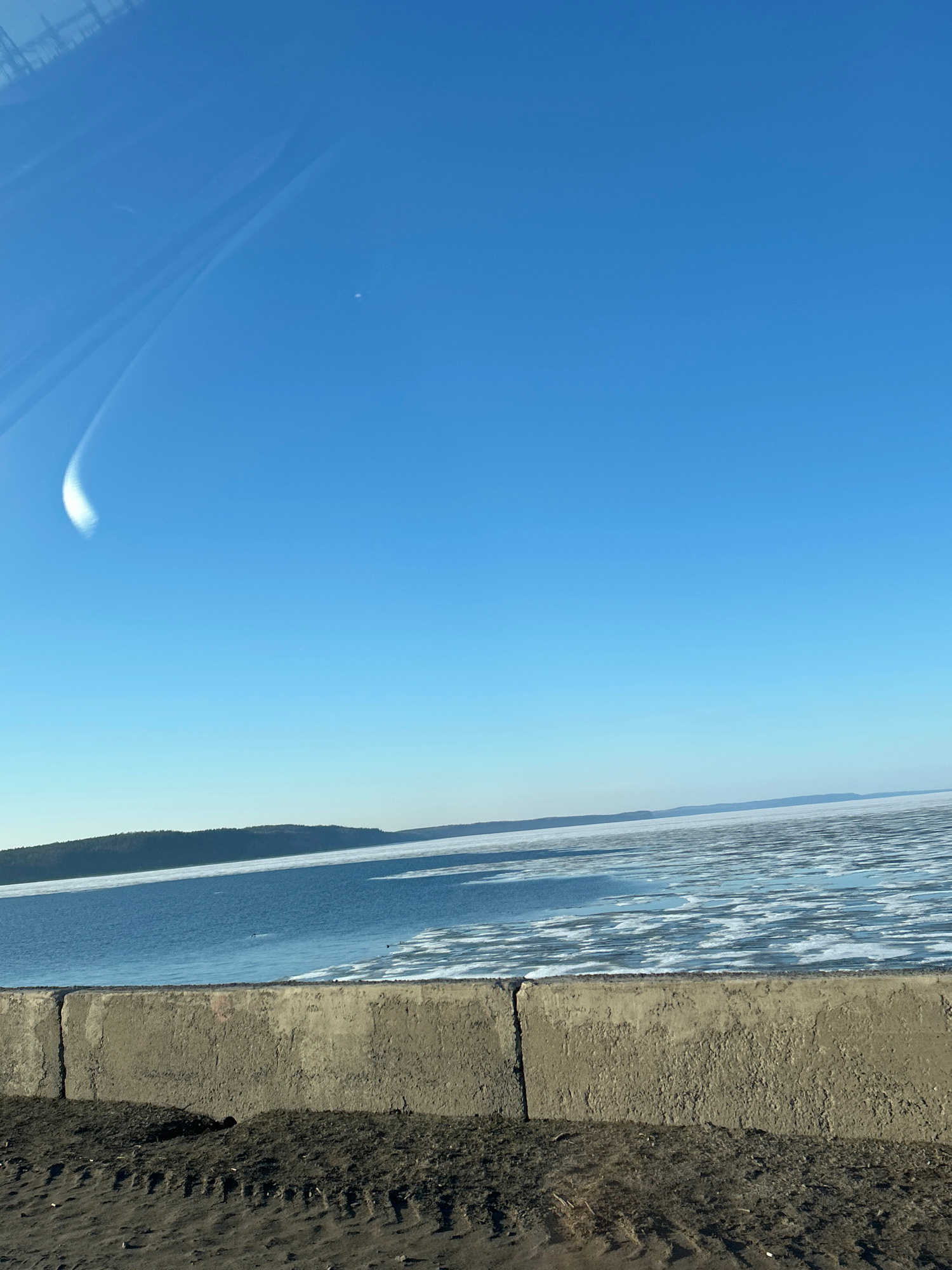 The image shows a view of the Kama River in Chaikovsky, Russia. The river is partially frozen, with ice floes visible on the water's surface. On the right side of the image, there is a concrete embank…read more