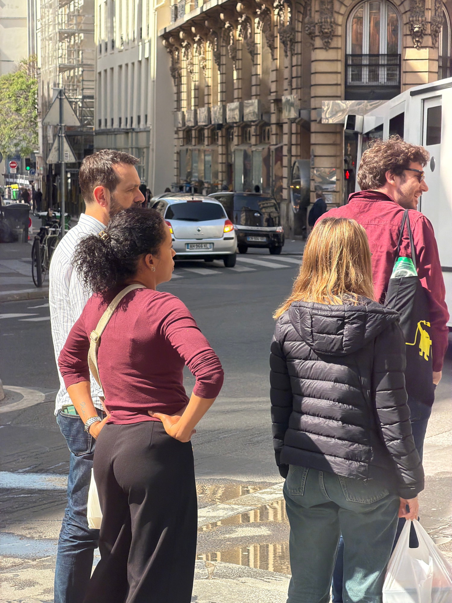 Two pairs of people are standing on a city street. The first pair consists of a man in a red shirt and jeans with a bag slung over his shoulder. He is standing next to a woman with blonde hair weari…read more