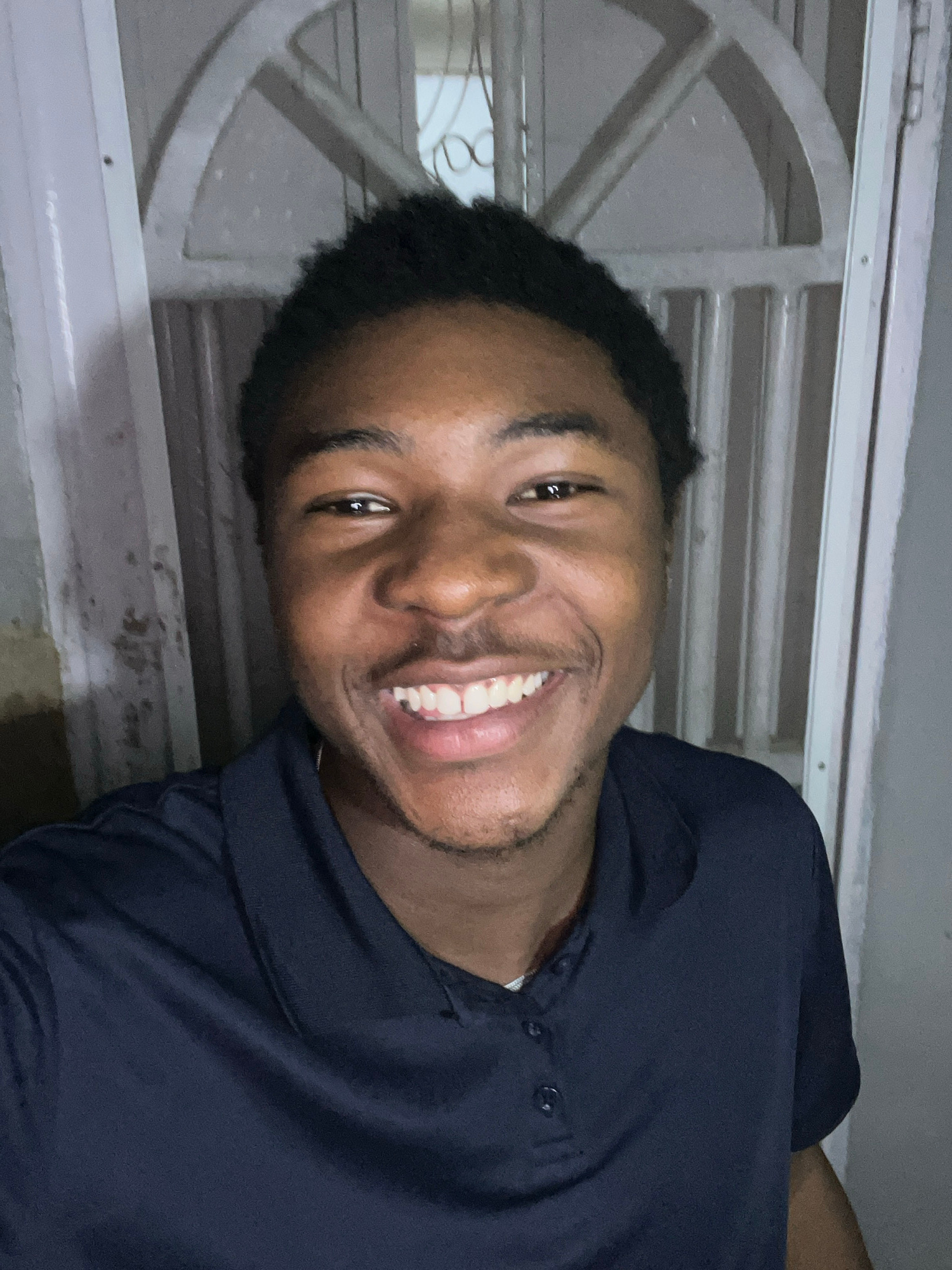 A young man smiles directly at the camera. He has dark hair and brown skin, and wears a dark blue polo shirt. Behind him is a window with white bars. The location is possibly in Jos, Nigeria.