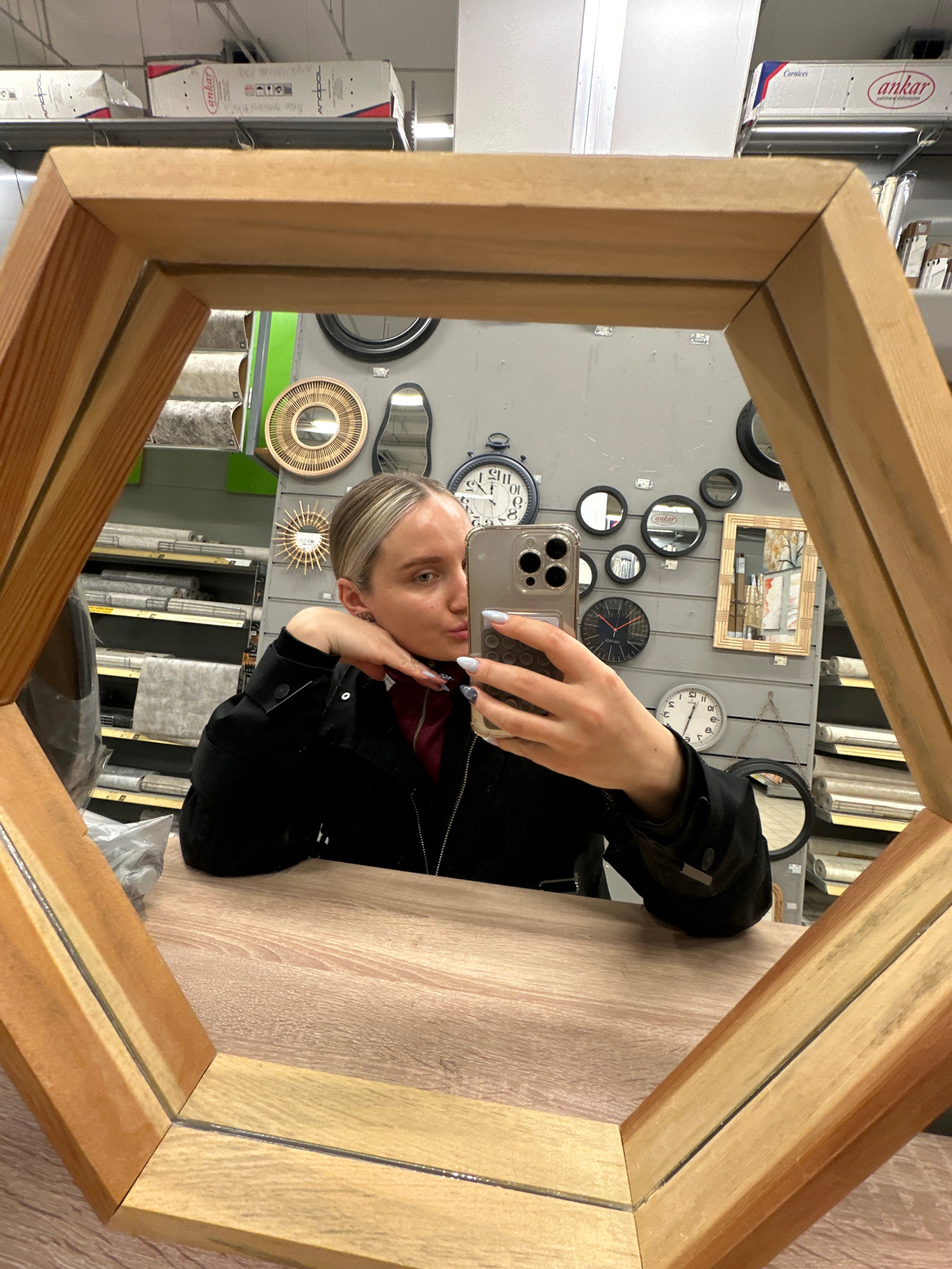 A woman is taking a selfie in a mirror. The mirror has a hexagonal, wooden frame. The background of the mirror reflection shows a wall with various clocks and mirrors on display, along with shelving u…read more
