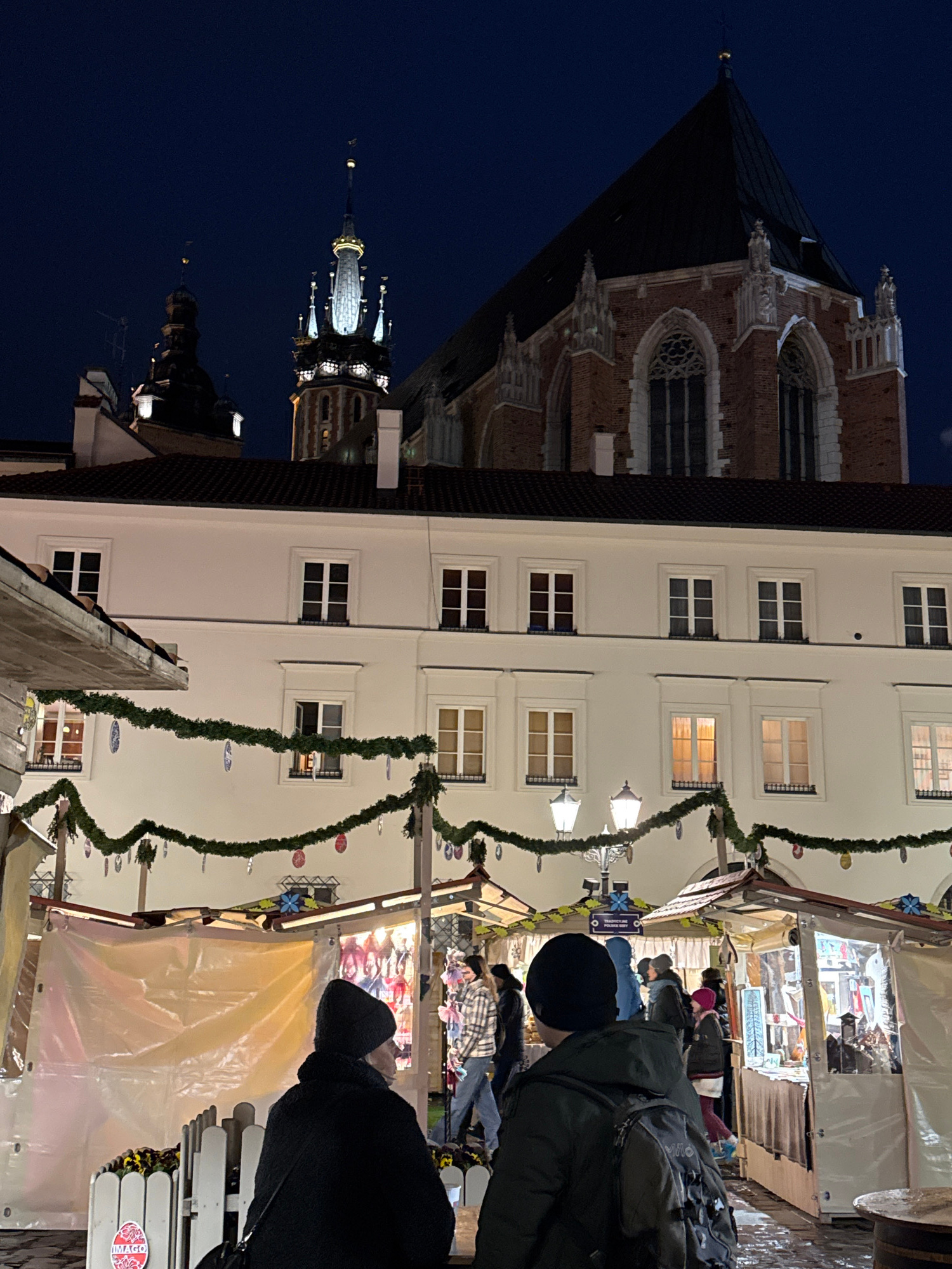 The image shows a street scene in Krakow, Poland at night. In the background are the towers of St. Mary's Basilica. To the right, there are market stalls decorated with garland. People are walking aro…read more