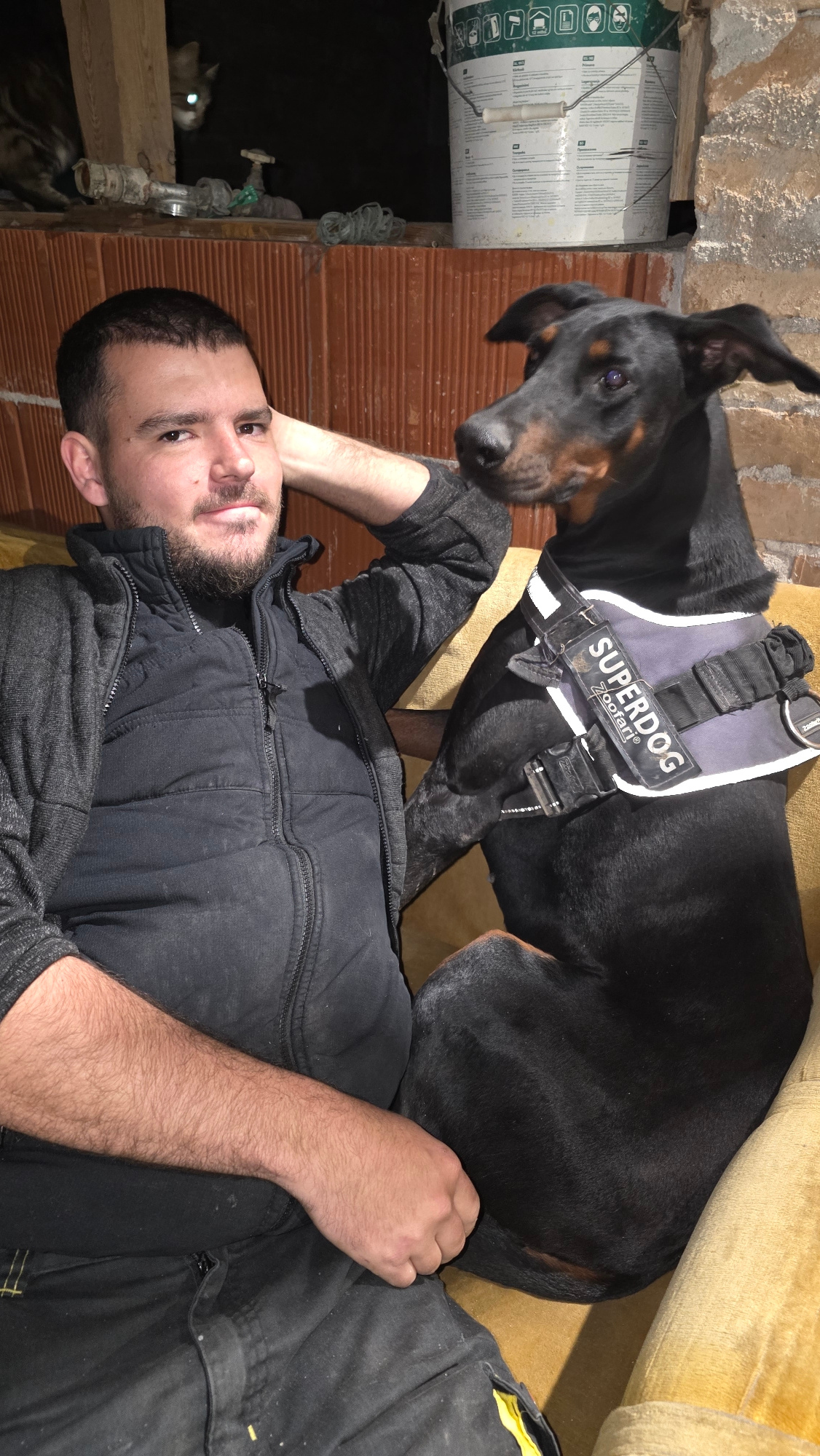 A male subject, approximately 20-35 years old with short dark hair and a beard, is seated on a yellow upholstered sofa. He is wearing a dark gray full-zip hooded sweatshirt over a black zip-up puffer…read more