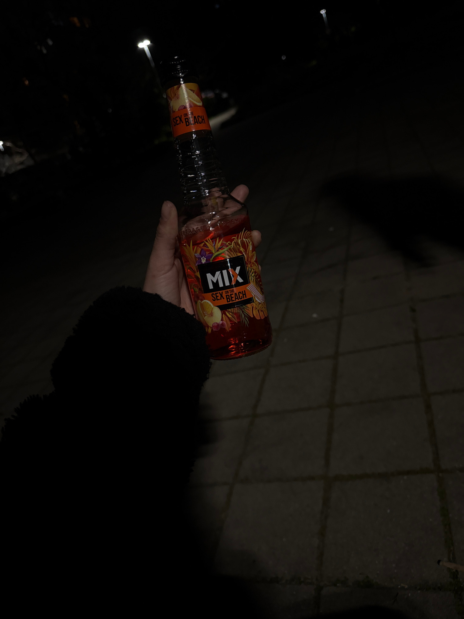 In an exterior setting, a person holds a partially consumed bottle of "MIX on the BEACH" beverage in their hand. The scene is dimly lit, with a paved surface suggesting an urban environment, possibly…read more