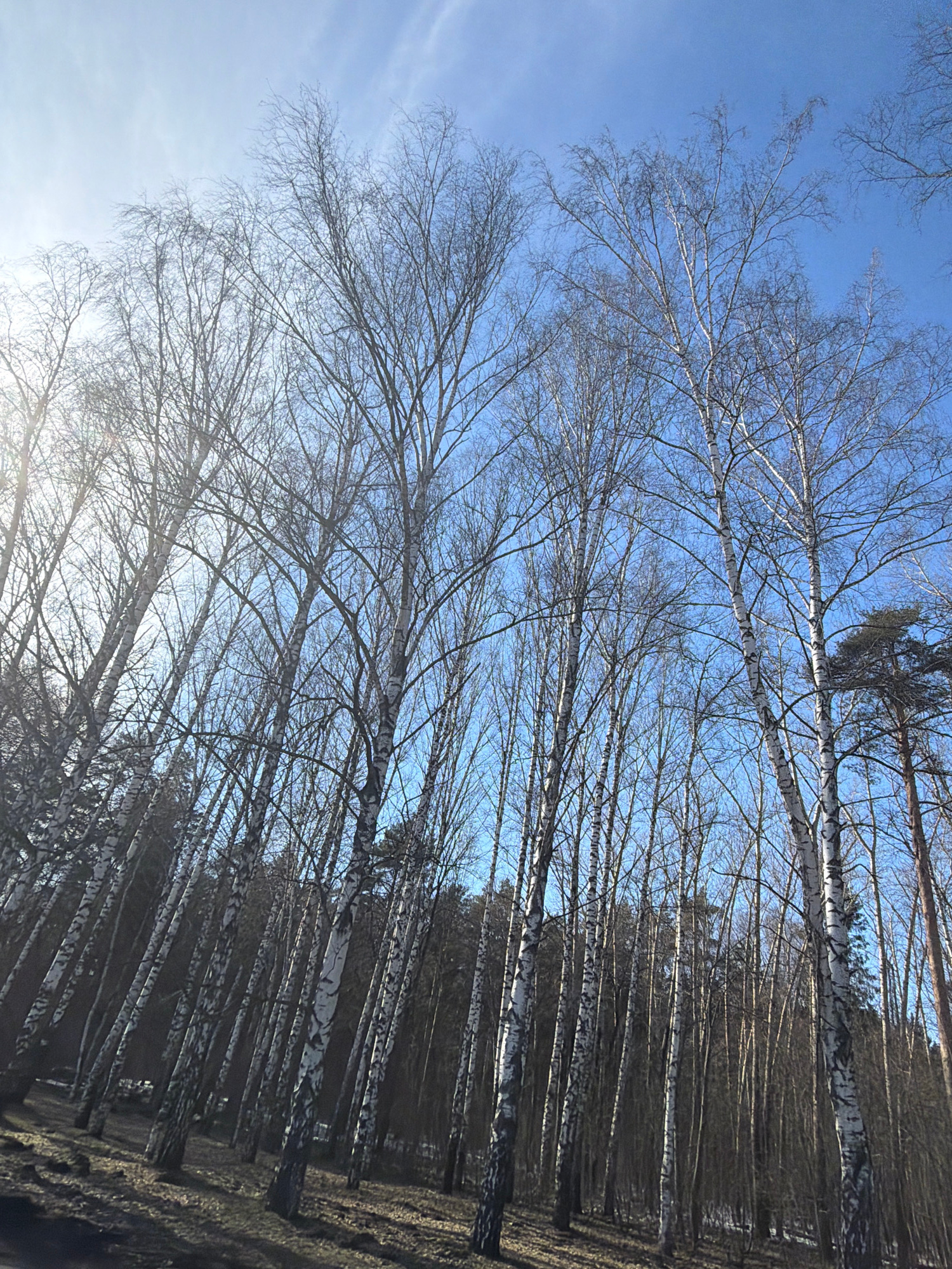 A birch forest stands in Perm, Russia, beneath a clear, blue sky. The leafless trees have white bark with black markings. Bare branches reach towards the sky, intersecting. The sun is shining. The for…read more