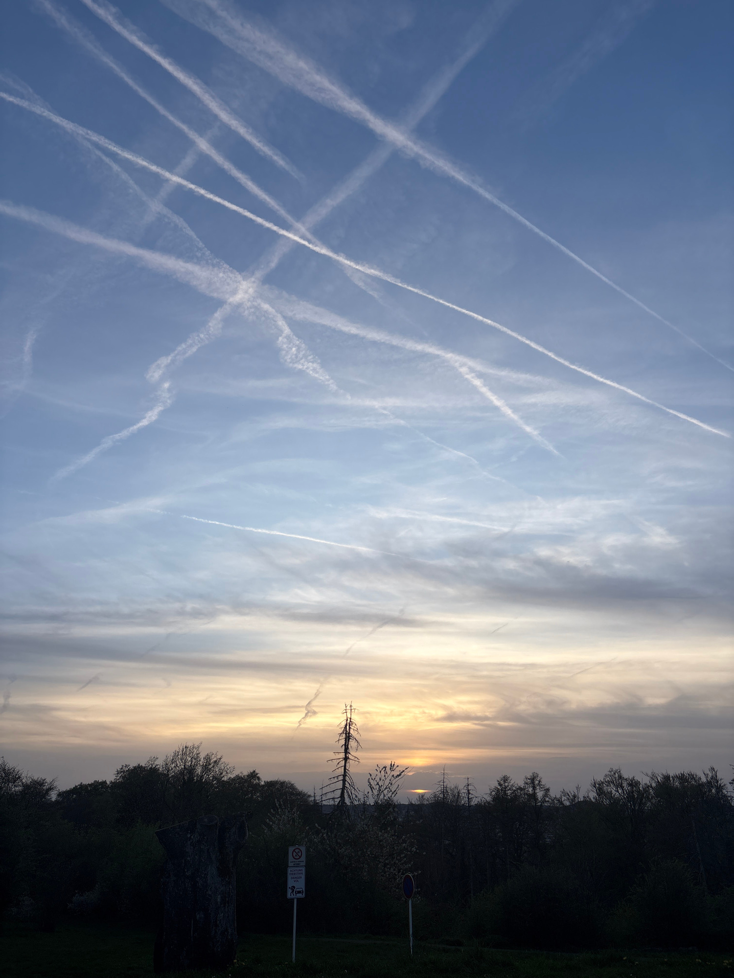 The image captures a sky filled with contrails over Schifflange, Luxembourg. The sky transitions from blue to a golden hue near the horizon, where the sun is setting. A line of trees is visible in theβ¦read more