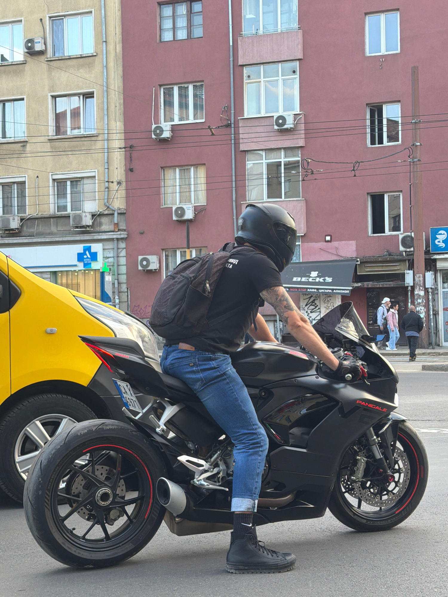 The image shows a man on a black motorcycle, parked next to a yellow car. The motorcycle is identified as a "PANIGALE". The man wears a black helmet, a black t-shirt, blue jeans, and black boots, and…read more