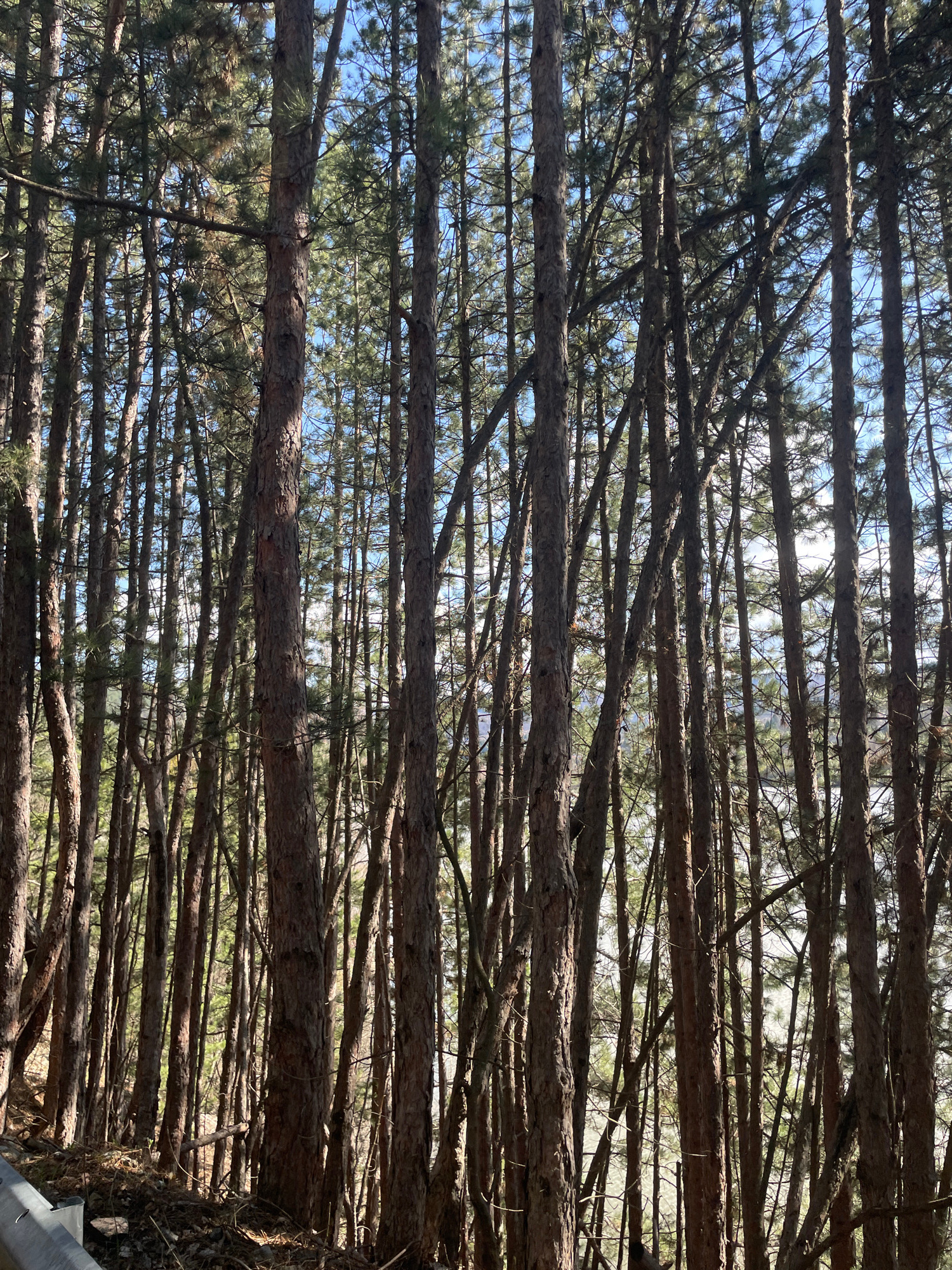 The image shows a view looking upwards through the trunks and branches of pine trees. The location is likely near Pancharevo, Bulgaria. The tree trunks appear parallel and horizontal. The sky is visibβ¦read more