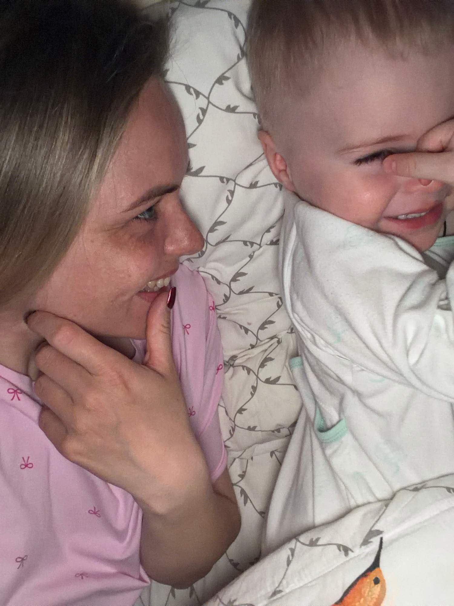 A woman and a baby are lying in bed. The woman is on her side, facing left, and the baby is above her, facing the top of the frame. The woman is wearing a pink top with bow decorations, and she has li…read more