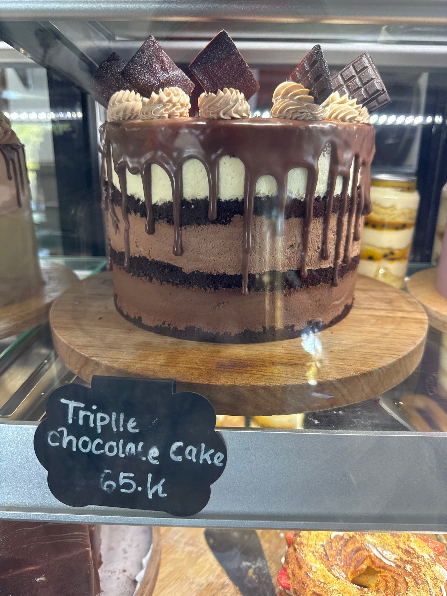 The image captures a slice of triple chocolate cake displayed in a glass case, likely in a bakery or cafe. The cake sits on a wooden serving board, accompanied by a small black signboard stating "Trip…read more
