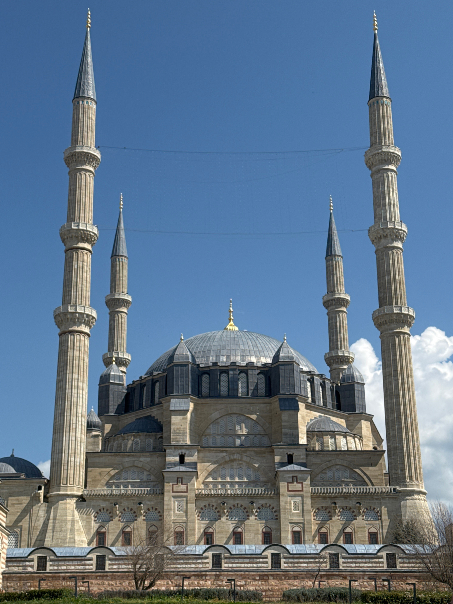 The Selimiye Mosque stands prominently against a clear blue sky with scattered white clouds. The mosque features a large central dome flanked by smaller domes and multiple minarets that reach skyward.…read more