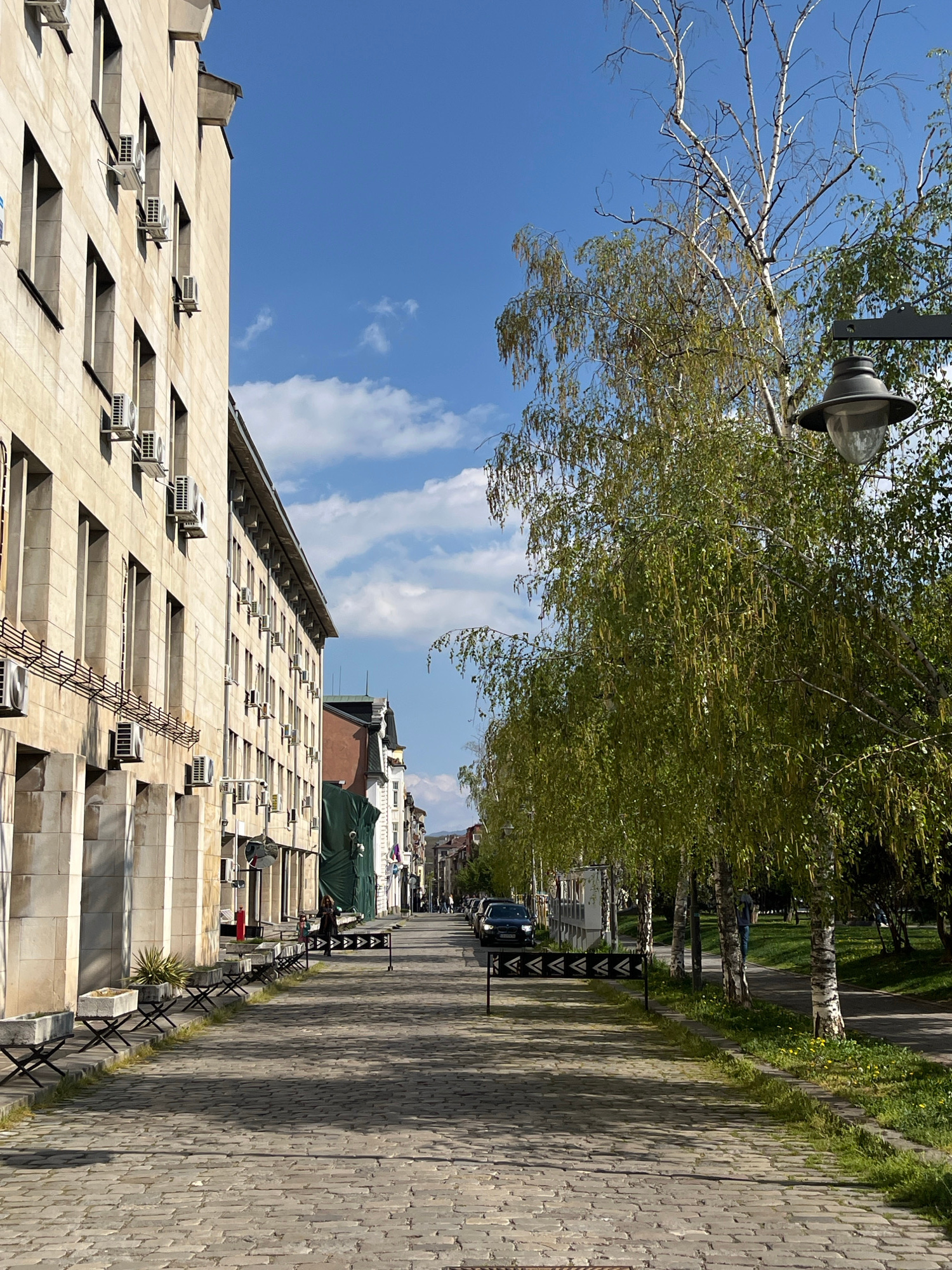 This is an outdoor shot taken in Sofia, Bulgaria, of a tree-lined street with a tall building and blue sky. The image is vertically oriented, portraying a building on the left, a street running into…read more