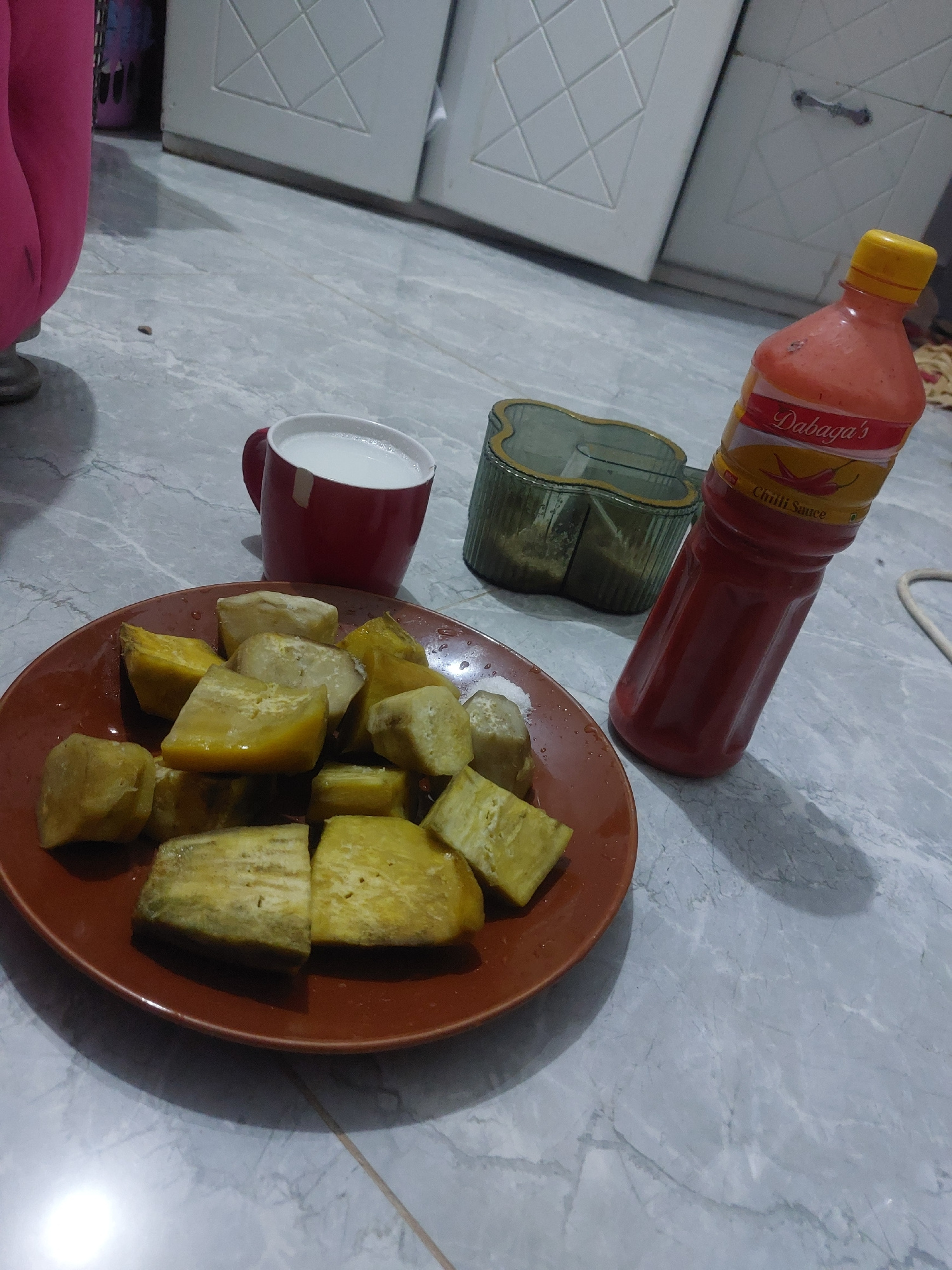 A high-angle shot displays a dining arrangement on a grey marble-patterned surface. A brown plate filled with cubed yellow sweet potatoes dominates the right side. Beside the plate sits a red mug cont…read more