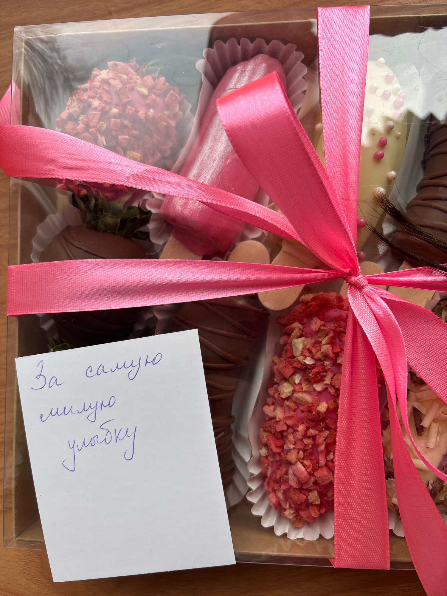 A top-down, medium shot shows a clear plastic box with a pink ribbon tied around it, containing a variety of chocolate-covered strawberries. A card sits next to the box, bearing text in Russian. The b…read more