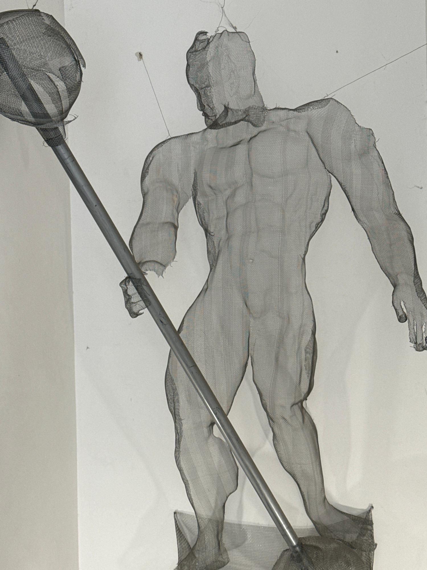 This media file displays an art installation featuring a dynamic sculpture of a male human figure. The figure is crafted from a dark, fine wire mesh, giving it a translucent and ethereal quality. It i…read more