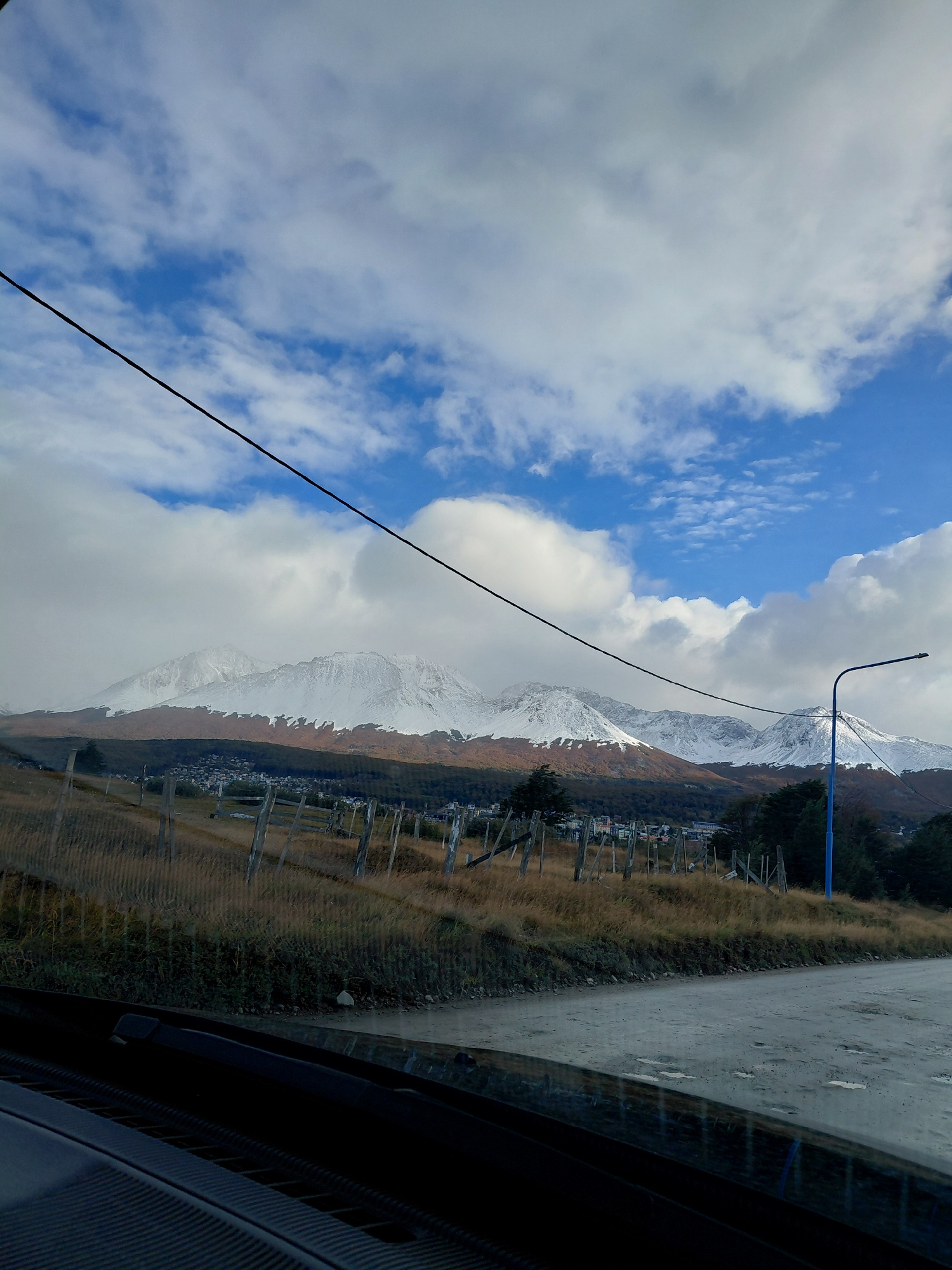 The image is taken from inside a vehicle, likely a car, with a view through the windshield. The scene depicts a landscape with mountains partially covered in snow, likely in the distance, under a sky…read more