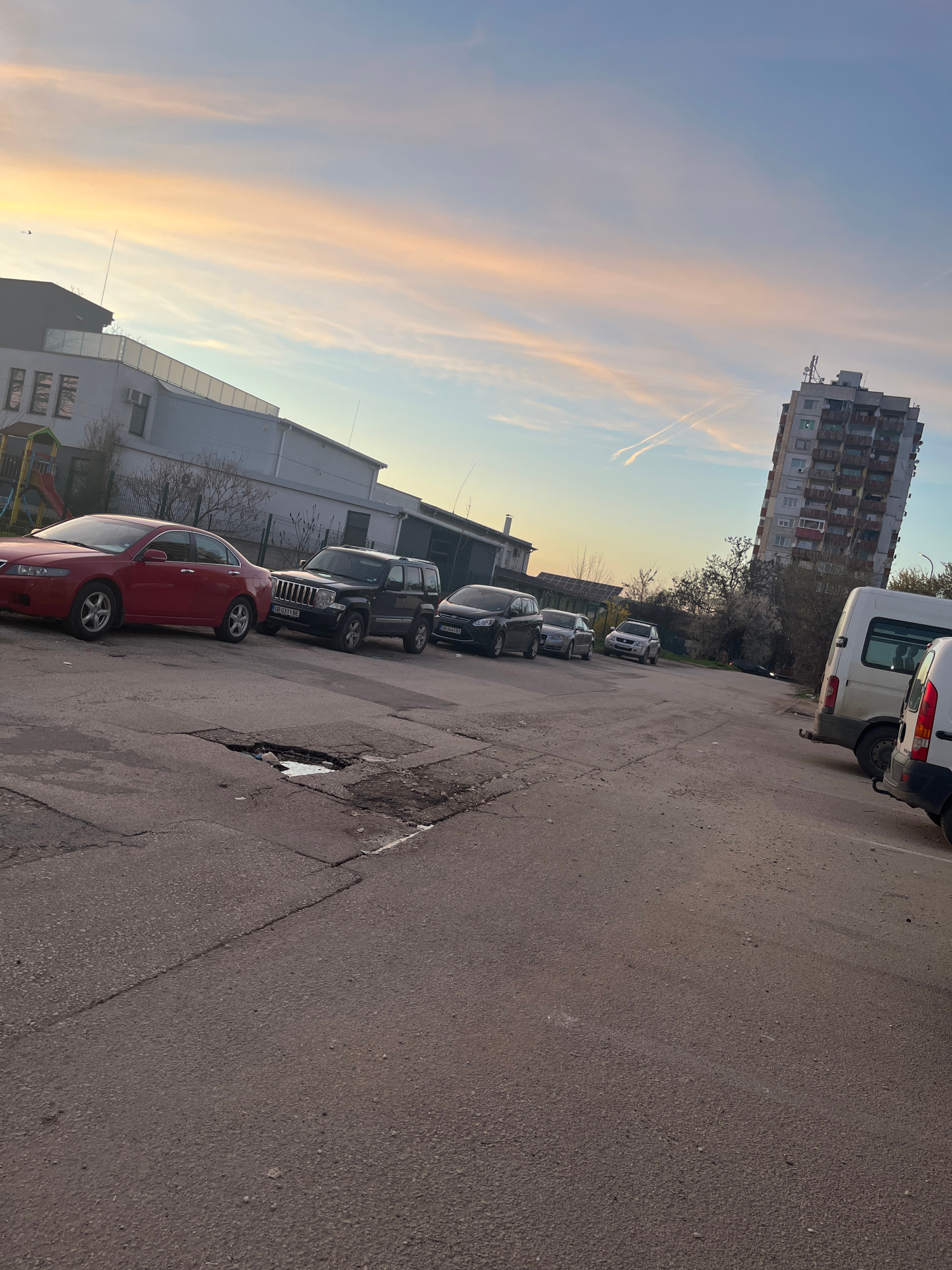 The image depicts a street scene in Lovech, Bulgaria. The perspective is angled, showing parked vehicles lining the side of the road. A red sedan is parked prominently at the lower edge of the image. Further down the street, a row of dark-colored cars and a white van are parked. A tall, multi-story apartment building is visible in the background. To the left, a lower-rise building is present. The sky is visible, with streaks of pink and blue suggesting either sunrise or sunset. The asphalt street shows signs of wear and tear. | Open Wire