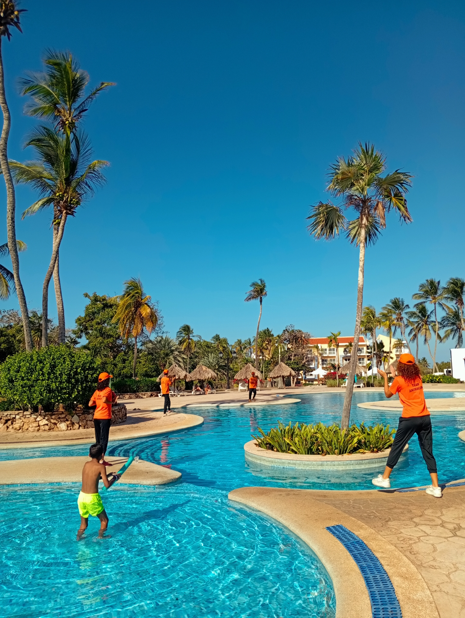 At a resort pool in Playa El Agua, Venezuela, a young boy wearing neon green swim trunks stands in the clear, turquoise water, holding a long, blue pool noodle. Around the pool, on tan-colored walkwayβ¦read more