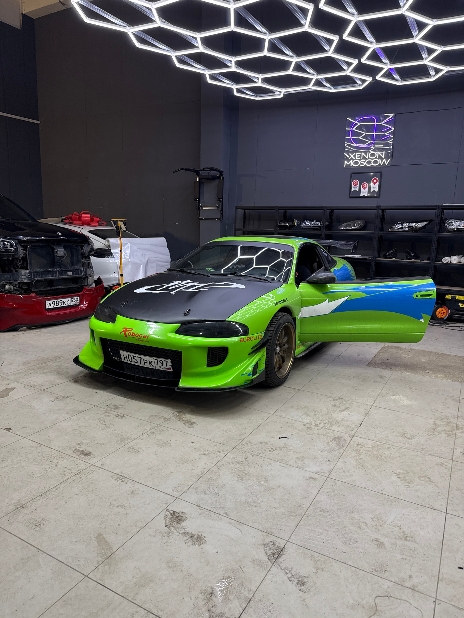 The image depicts a lime green and black customized car with a blue and white graphic on the open driver's side door. The car has the license plate "H057PK797" from Russia. In the background, a neon s…read more
