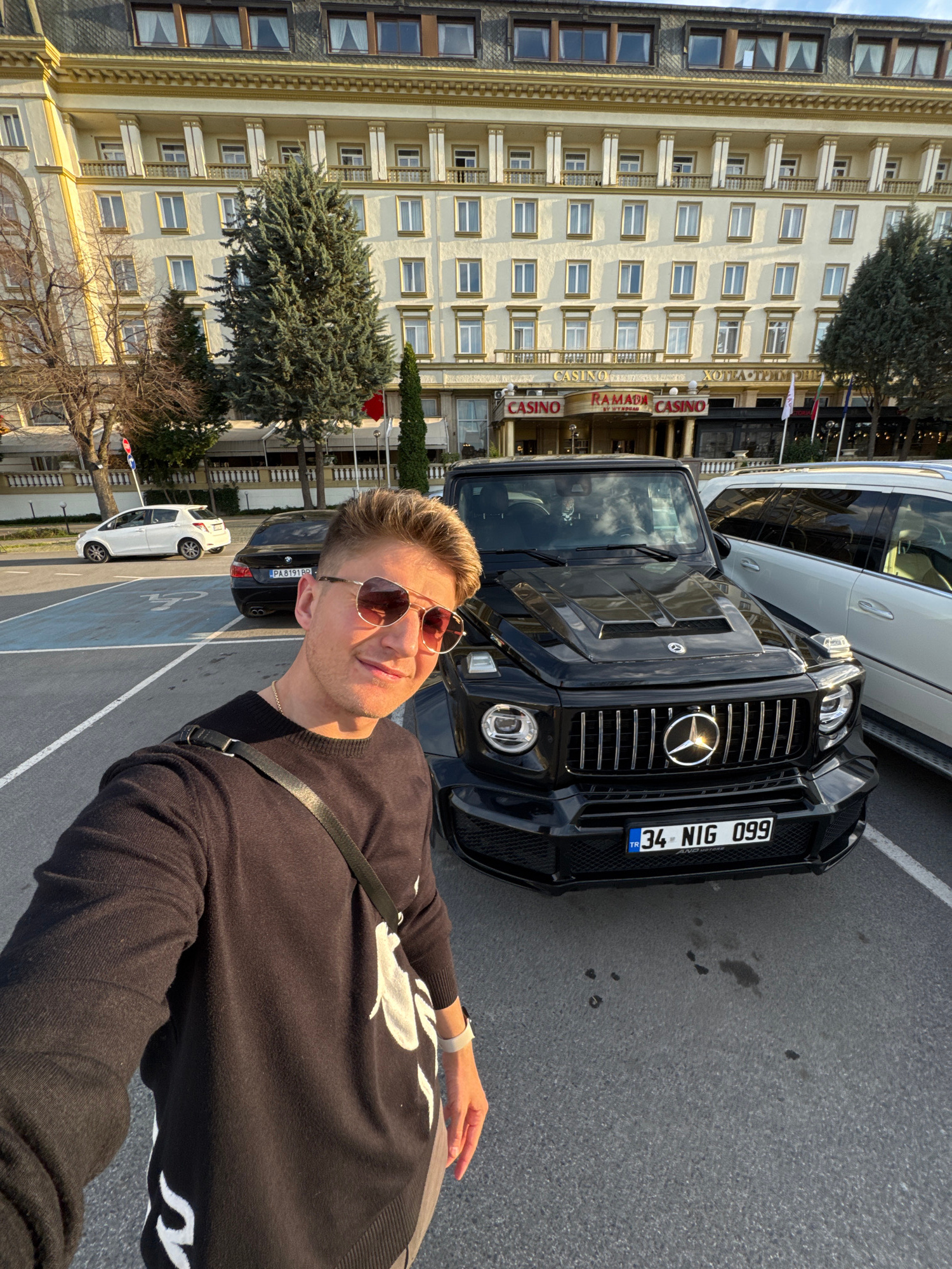 A man wearing sunglasses and a dark sweater stands on a gray surface with white painted lines, likely a parking area. He is taking a selfie with a black luxury SUV behind him, revealing a license platβ¦read more