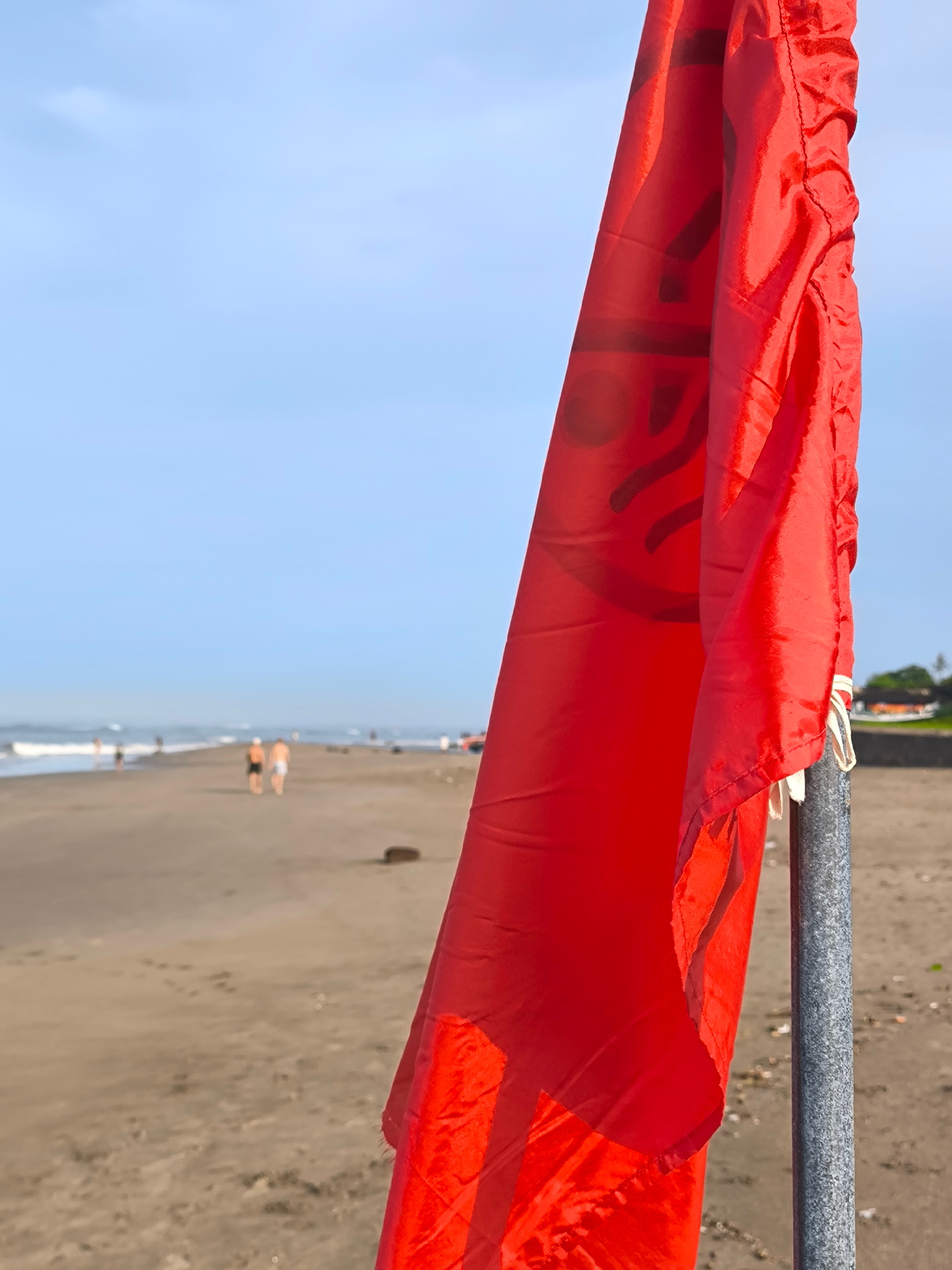 A red warning flag is prominently displayed on a gray metal pole, standing on a beach in Tibubeneng, Indonesia. The flag partially obscures the view of the beach and the blue sky above. In the backgro…read more