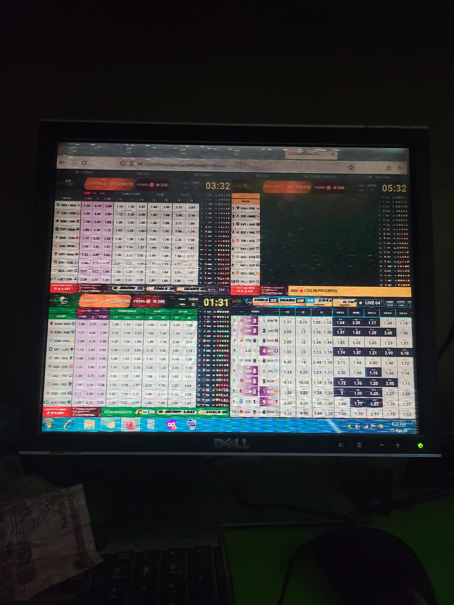 The image shows a computer monitor displaying a betting website, likely Bet9ja, with live soccer game odds. The monitor is a Dell model. The screen displays various match statistics and betting option…read more