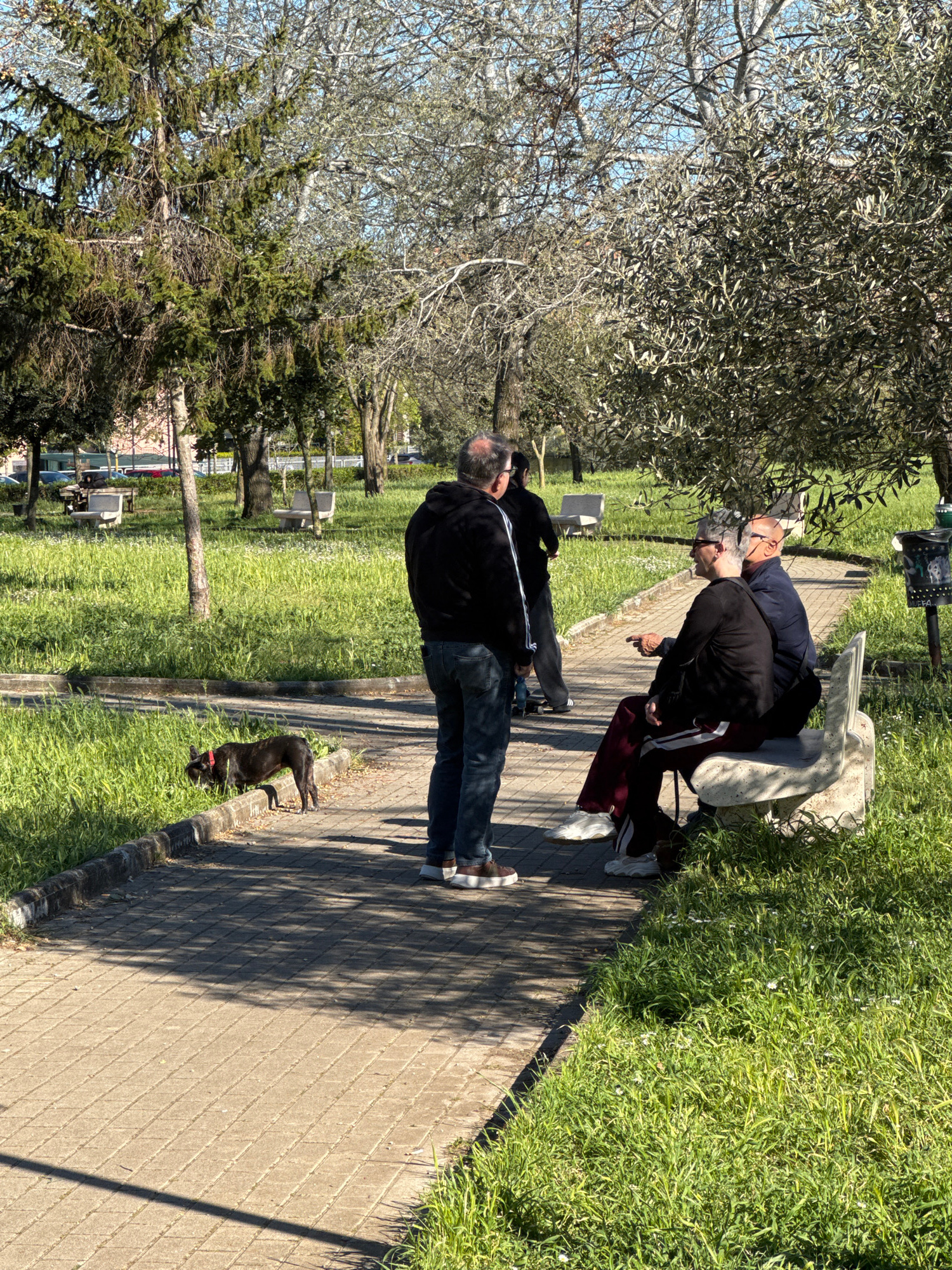 The image depicts a park setting in Aprilia, Italy. A paved walkway runs through the park, with grassy areas and trees on either side. Two older men are seated on a white bench, appearing to converse.…read more