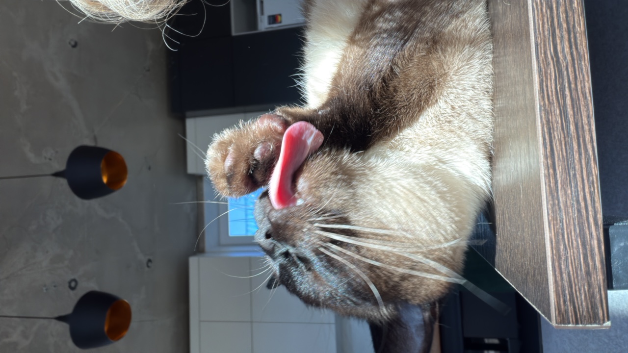 A close-up photograph features a Siamese cat. The cat's face is the primary subject, showcasing its distinctive color points, blue eyes, and whiskers. The background is blurred, directing focus to the…read more