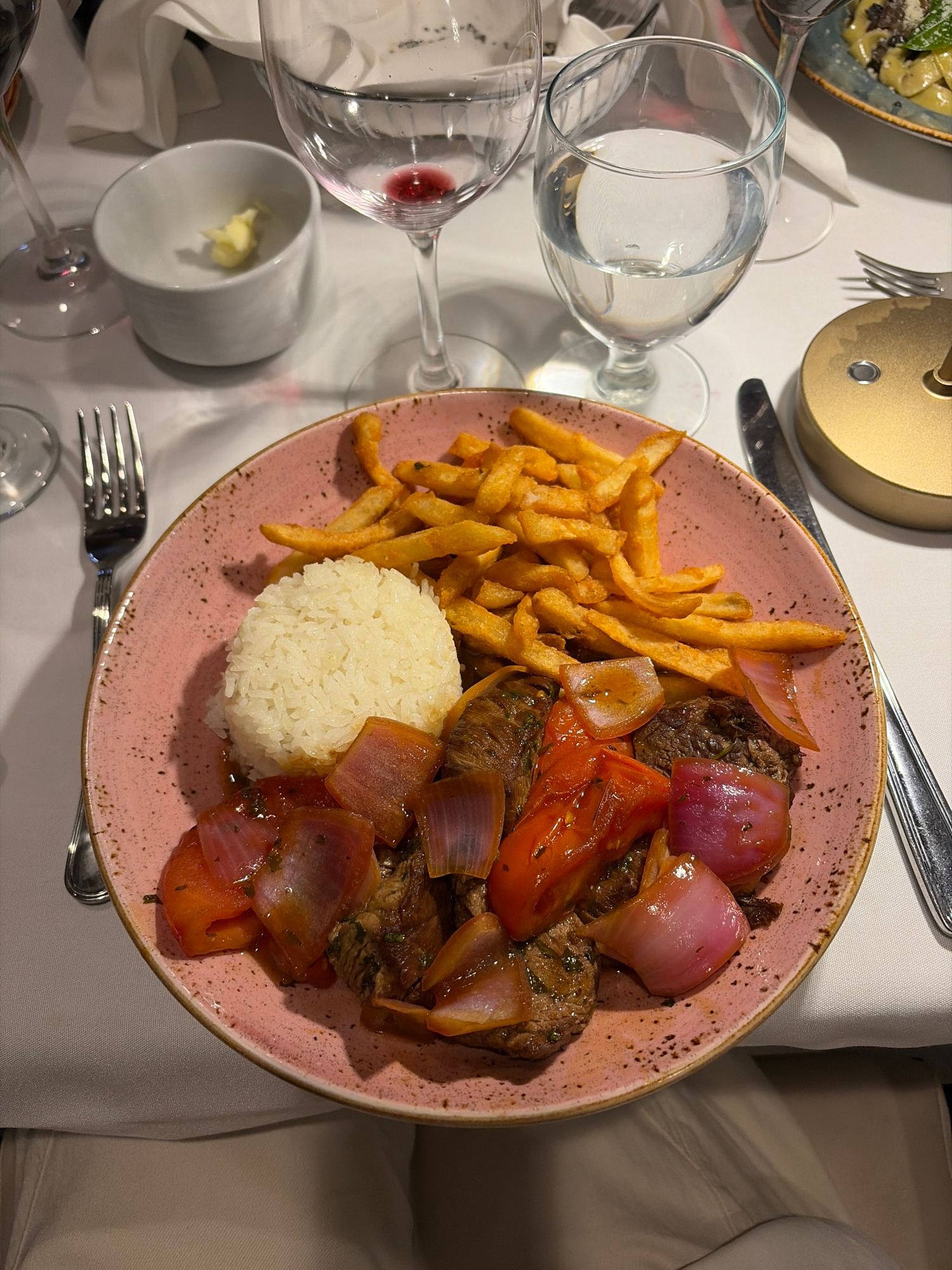 The image depicts a plate of Lomo Saltado, a traditional Peruvian stir-fry, consisting of marinated strips of sirloin, onions, tomatoes, French fries, and rice. The plate is pink and speckled, placed…read more