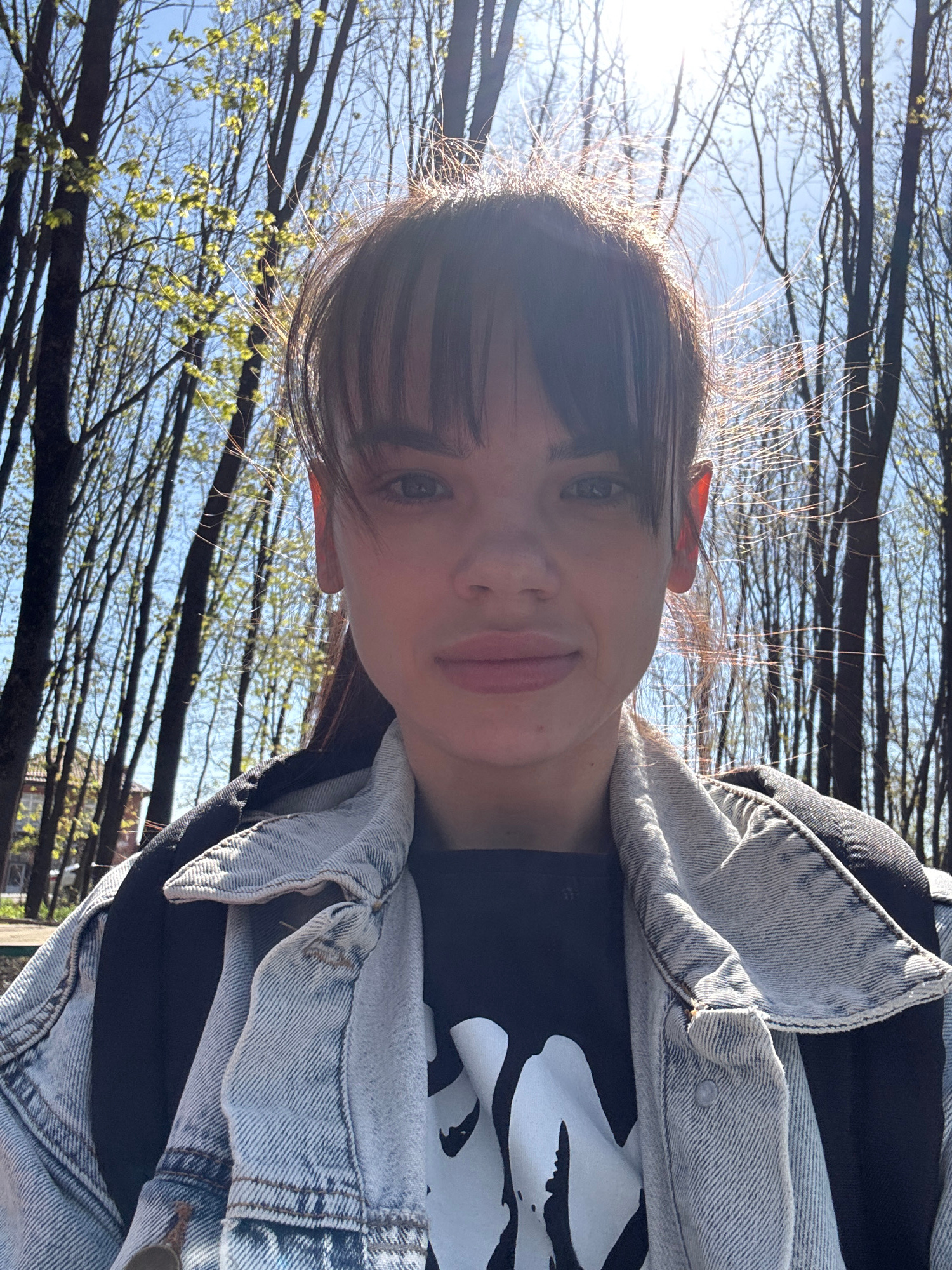 A bright, rotated outdoor selfie captures a young woman looking directly at the camera with a neutral to slightly smiling expression. The image is oriented with her head on the left and her shoulders…read more