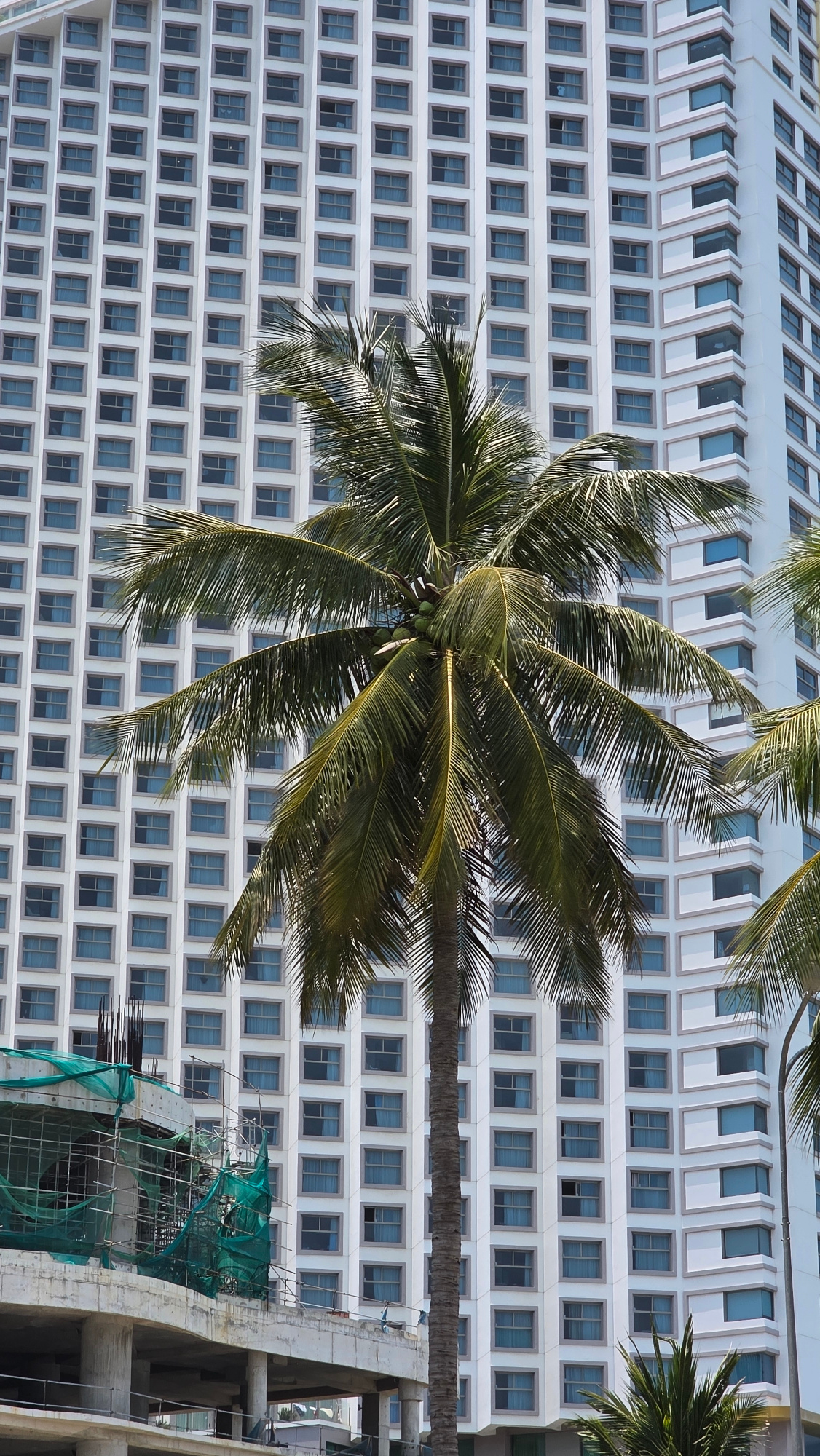 The image depicts a palm tree in the foreground with a large, white building in the background. The building has a grid-like facade of numerous square windows. A construction site with scaffolding cov…read more