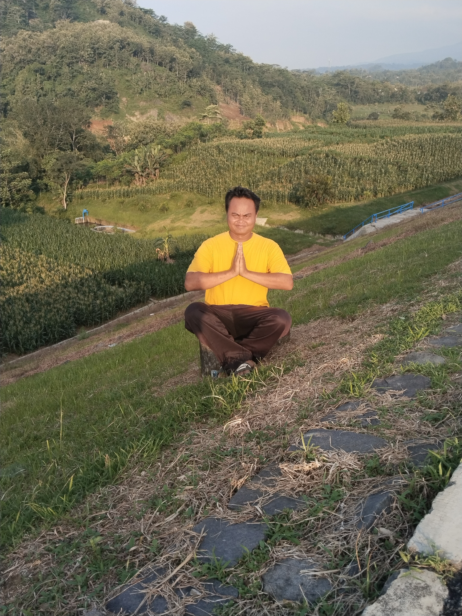 The image shows an individual seated in a meditative pose outdoors. The person, wearing a yellow t-shirt and brown pants, is cross-legged with hands pressed together in front of the chest. The setting…read more