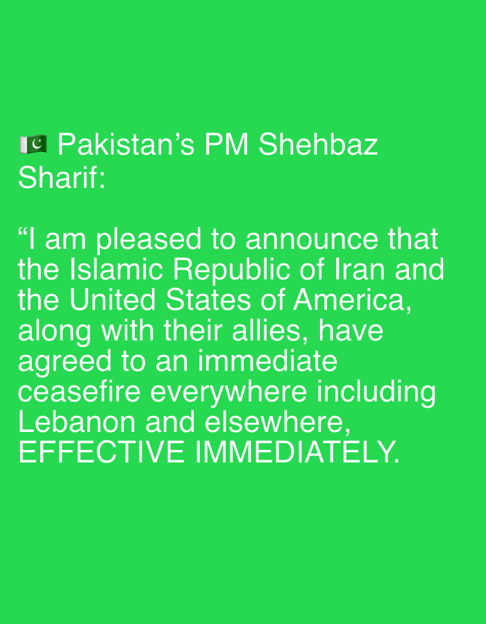 The image shows text on a green background. The text reads: "Pakistan's PM Shehbaz Sharif: 'I am pleased to announce that the Islamic Republic of Iran and the United States of America, along with thei…read more